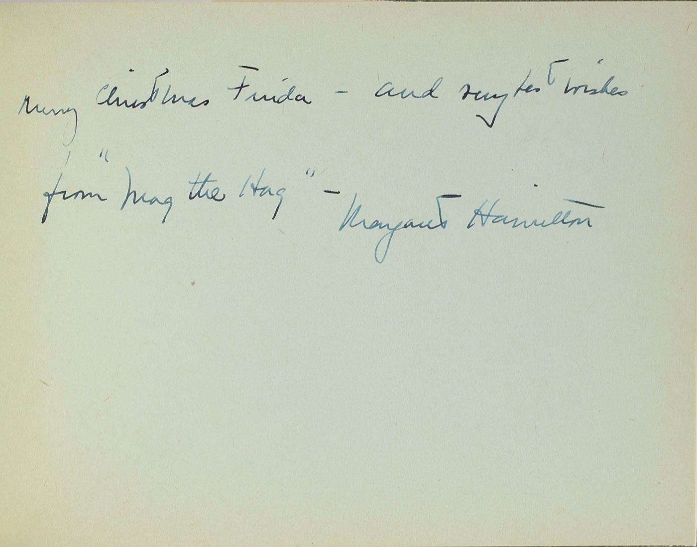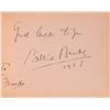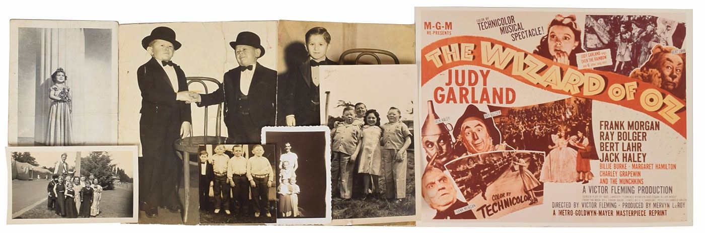 Wonderful vintage autograph booklet, 6.25 x 4.5, deriving from the personal collection of Frieda Betsky, one of the original Munchkins from the classic 1939 film The Wizard of Oz. Signed inside in ink and fountain pen by several members of the legendary cast, including: "Good luck to you, Billie Burke, 1938, To Frieda," "Best wishes to Frieda, Victor Fleming," "Judy Garland," "Merry Christmas Frieda—and very best wishes, from 'Mag the Hag'—Margaret Hamilton," and "Bert Lahr." Also present within the booklet is a ballpoint signature, "Ray Bolger," on an off-white 5.5 x 4 sheet trimmed from a larger document. Included is a scrapbook compiled by Louie Bretsky, which contains numerous newspaper clippings documenting the partnership between Frieda, 'the world's smallest adult midget,' and Ike and Mike Rogers, 'the world famous midget twins.' Also included is a set of seven vintage photographs, ranging in size from 2.75 x 2.75 to 8 x 10, depicting Frieda, the identical Rogers twins, their manager Prince Adolph, and various other little people. In overall fine condition, with wear to some of the photos.