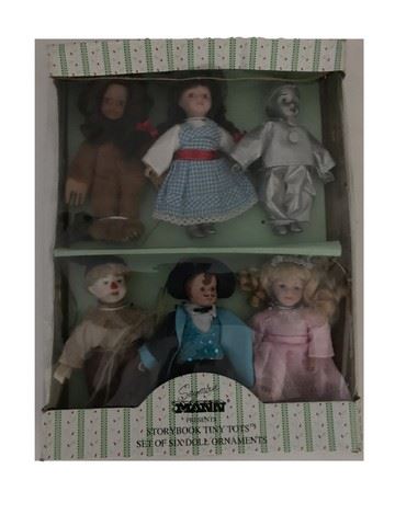 Seymour Mann presents story book tiny tots set of six doll ornaments featuring the Wizard of Oz. This doll set is a limited edition collection made exclusively for Dillards and features hand painted porcelain head, arms, and legs, and hand finished costumes with wonderful detail. Comes complete in a box with a window featuring all six characters. Box has never been opened but is slightly dented from storage.