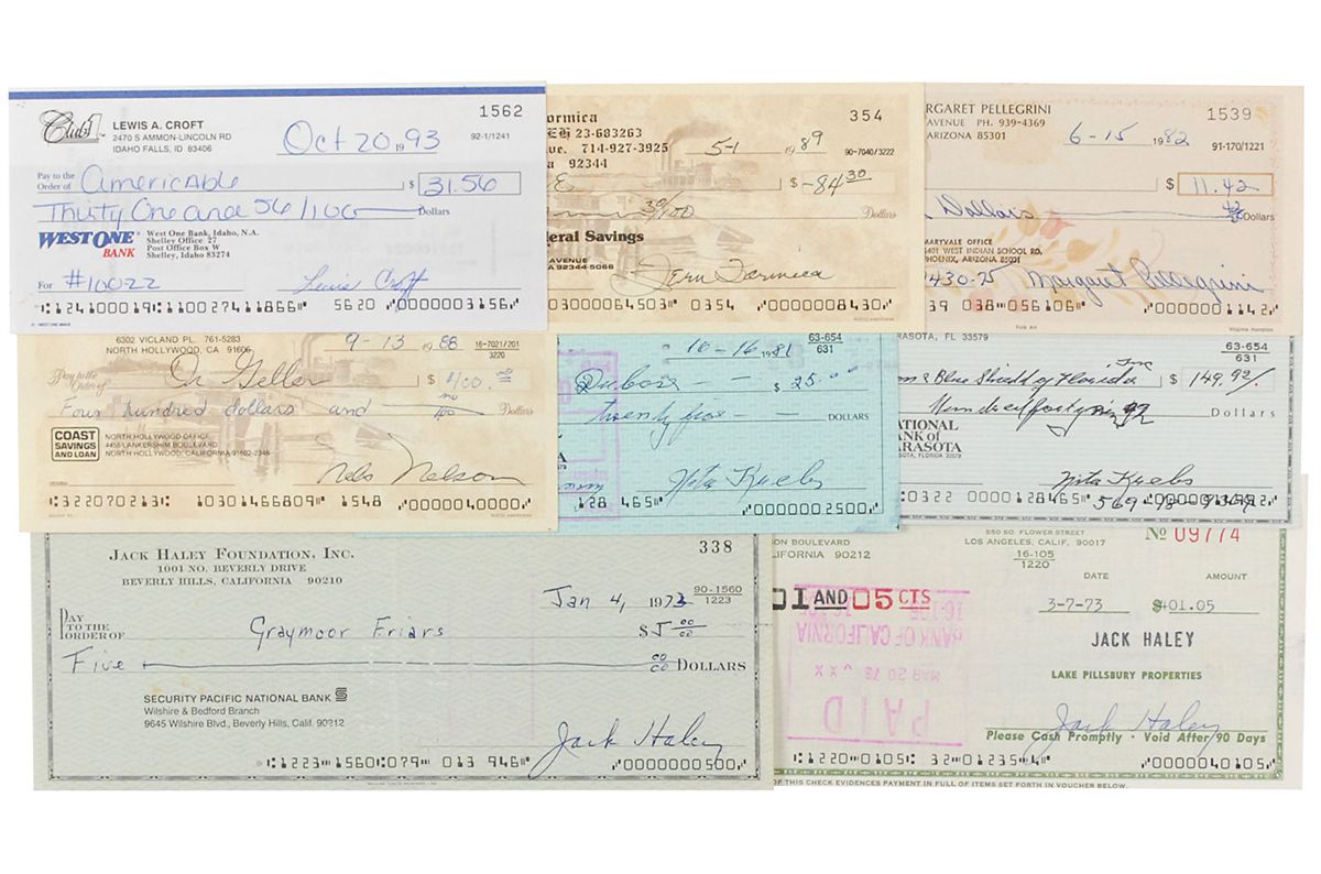 Collection of eight checks, dated between 1973 and 1989, each signed by an actor or actress appearing in the classic film, including: Jack Haley (2), Nita Krebs (2), Nels Nelson, Margaret Pellegrini, Lewis Croft, and Fern Formica. In overall fine condition, with expected bank stamps and cancellation holes. All but Haley, who played the Tin Man, were munchkins.