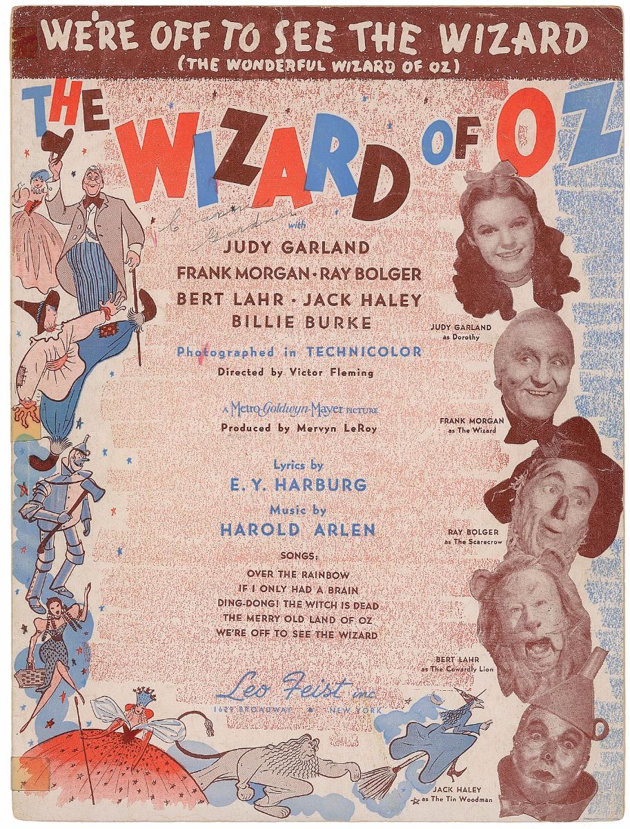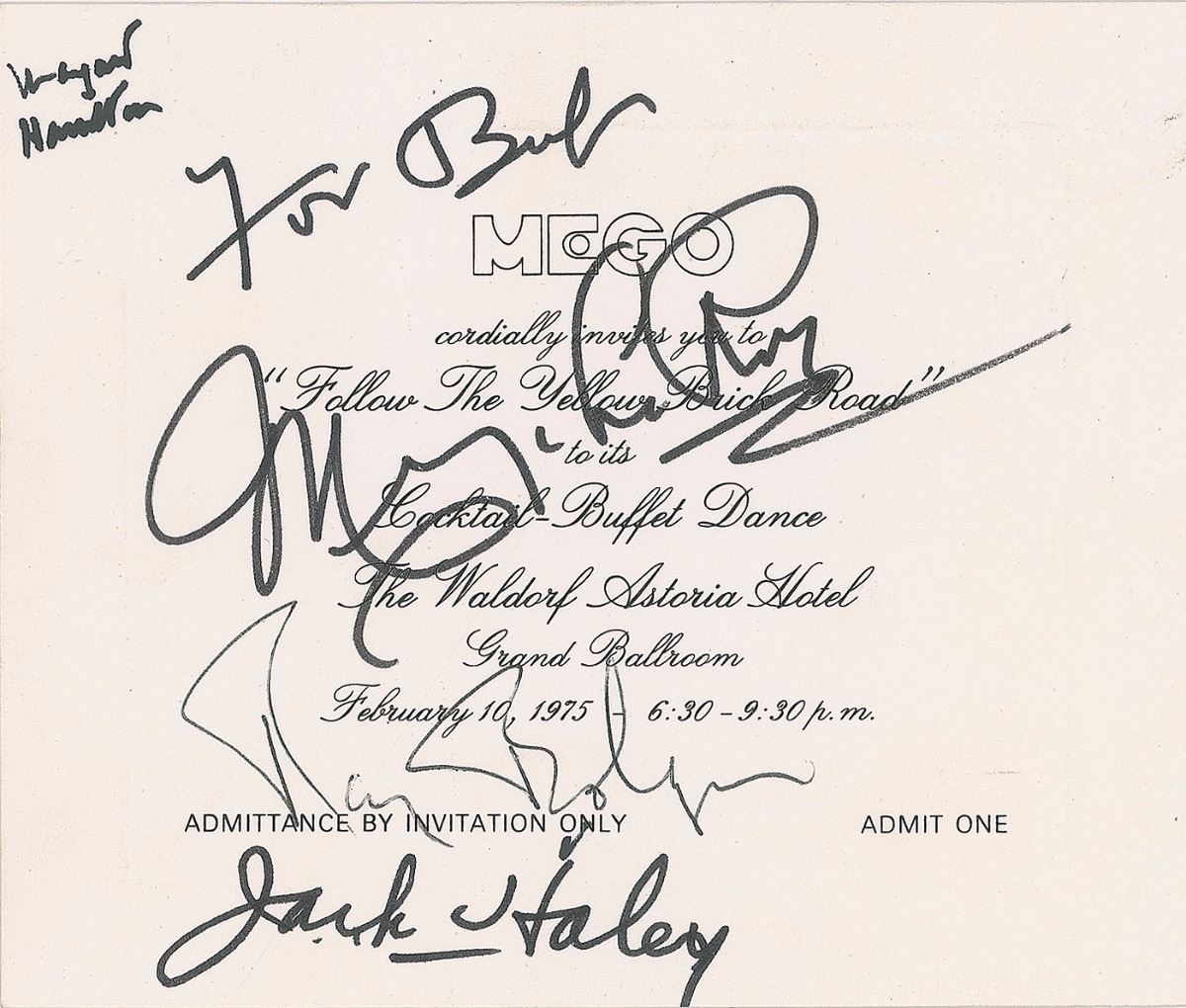 Invitation to a ‘Follow The Yellow Brick Road’ cocktail-buffet dance held at the Waldorf Astoria on February 10, 1975, 5.75 x 5, signed and inscribed in black felt tip, “For Bob, Mervyn LeRoy,” “Margaret Hamilton,” and “Jack Haley,” and in black ballpoint, “Ray Bolger.” In fine condition. Accompanied by an unsigned booklet of sheet music for ‘We’re Off to See the Wizard.’ An interesting format, boasting a nice assemblage of the film’s producer and three of its most memorable characters.