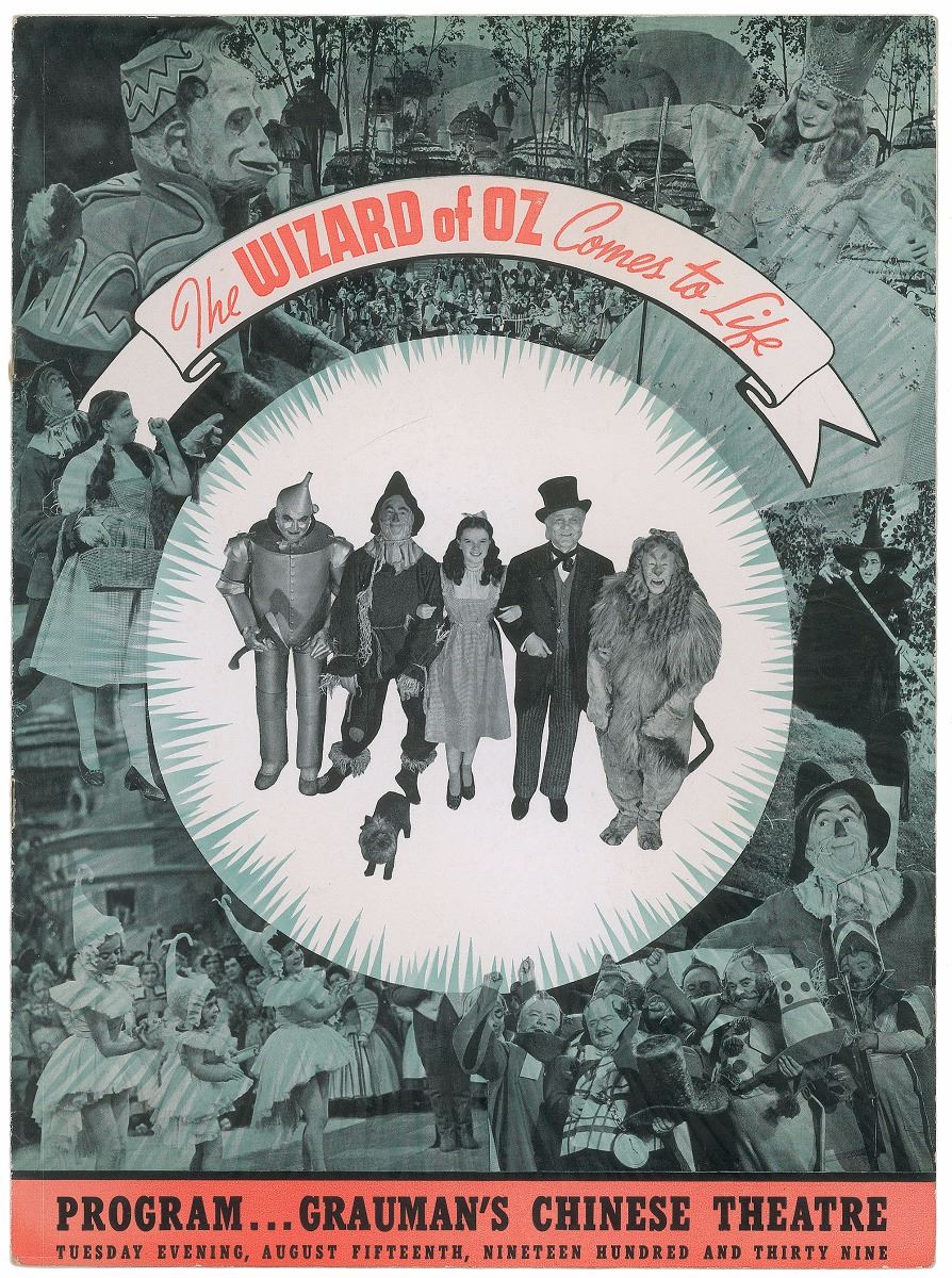 Gorgeous and exceedingly scarce unsigned program for the world premiere of Wizard of Oz at Grauman’s Chinese Theater on August 15, 1939, five pages, 10 x 13.75, featuring an image of the main cast on the front, surrounded by a collage of movie scenes. Inside are a cast list and two-page account of the film’s production. In fine condition, with some mild creases and soiling. Given out only at Grauman’s Theatre on a single day, these programs may well be one of the rarest and most desirable Wizard of Oz items obtainable.