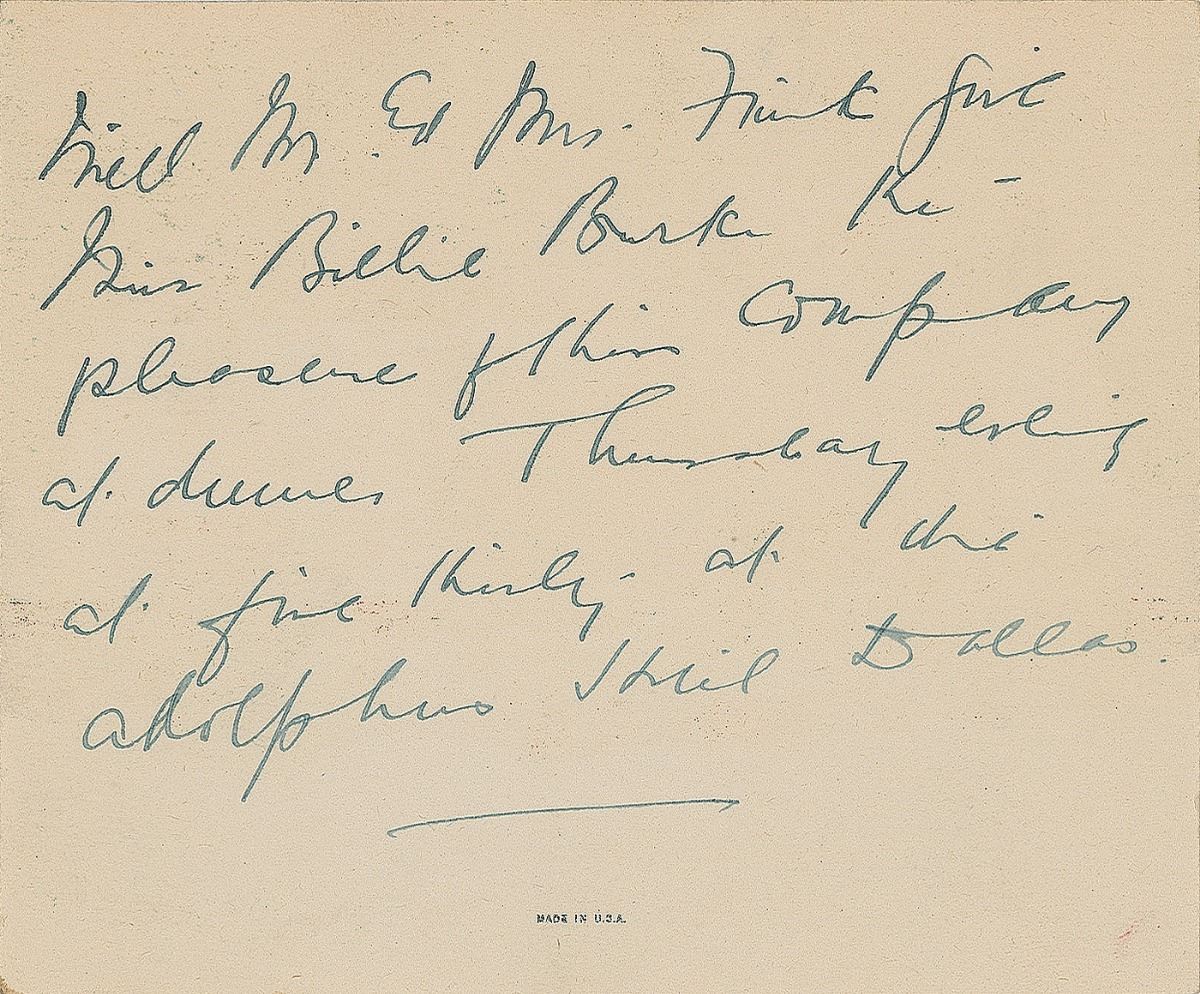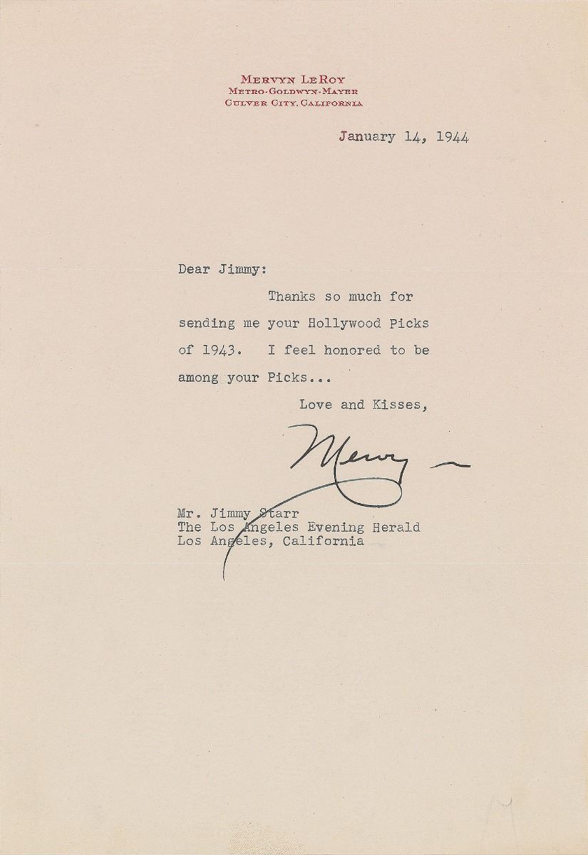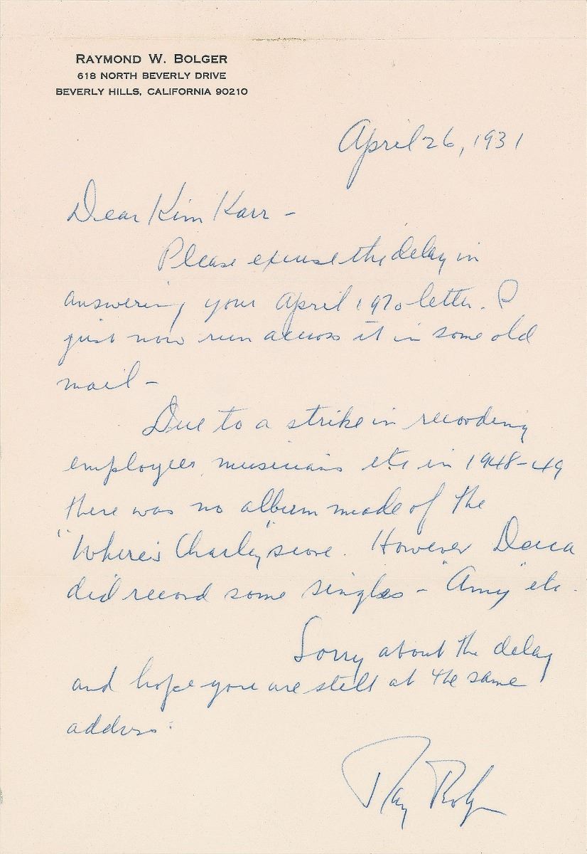 Three items: an ALS signed “Ray Bolger,” personal letterhead, April 26, 1931, in part: “Due to a strike in recording employees musicians etc in 1948–49 there was no album made of the ‘Where’s Charley’ score. However Decca did record some singles—‘Amy’ etc.”; a dinner invitation from Billie Burke on the back of a Thanksgiving card, no date, signed within the text, “Will Mr. & Mrs. Frink give Miss Billie Burke the pleasure of their company at dinner Thursday evening at five thirty at the Adolphus Hotel Dallas,” with Burke adding “P.T.O” to the front side; and a TLS from Mervyn LeRoy signed “Mervyn,” personal letterhead, January 14, 1944, in full: “Thanks so much for sending me your Hollywood Picks of 1943. I feel honored to be among your picks.” In overall fine condition.