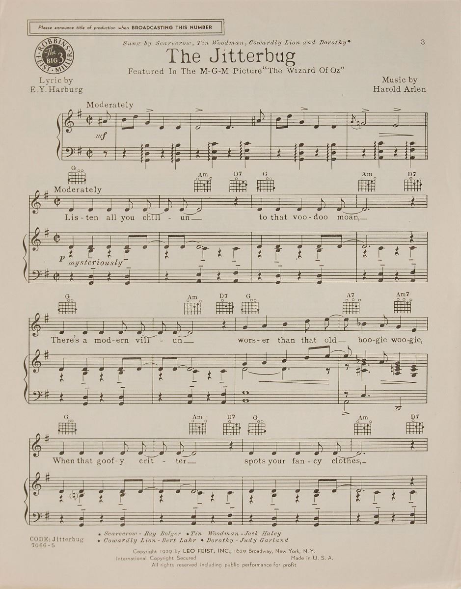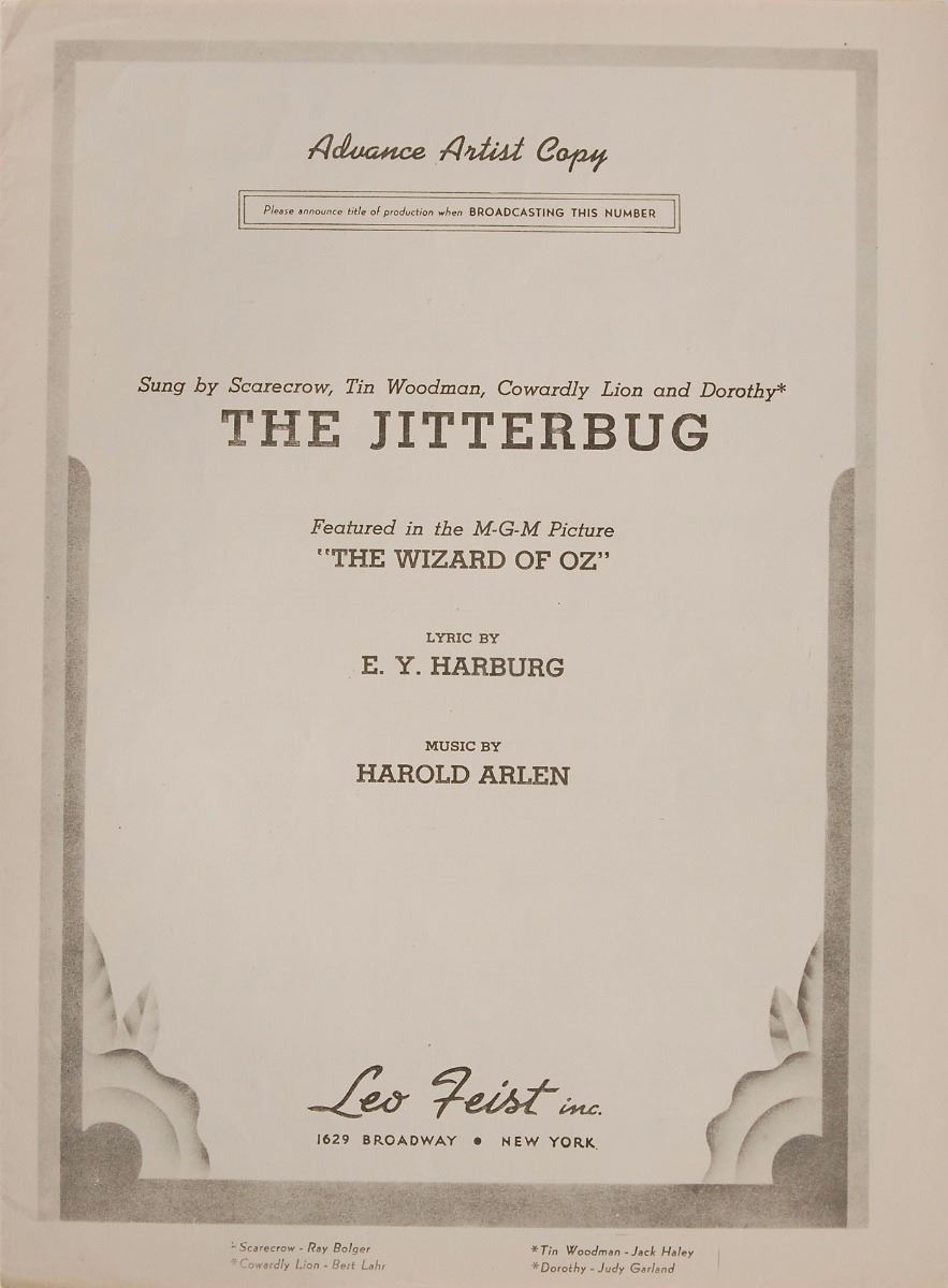 Unsigned advance artist copy of the sheet music to ‘The Jitterbug’ by E. Y. Harburg and Harold Arlen, seven pages, 8 x 11, published in New York by Leo Feist, Inc., 1939. In fine condition. This music was quickly suppressed after the number, sung by the Scarecrow, Tin Woodman, Cowardly Lion, and Dorothy, was cut from the final version of the film.