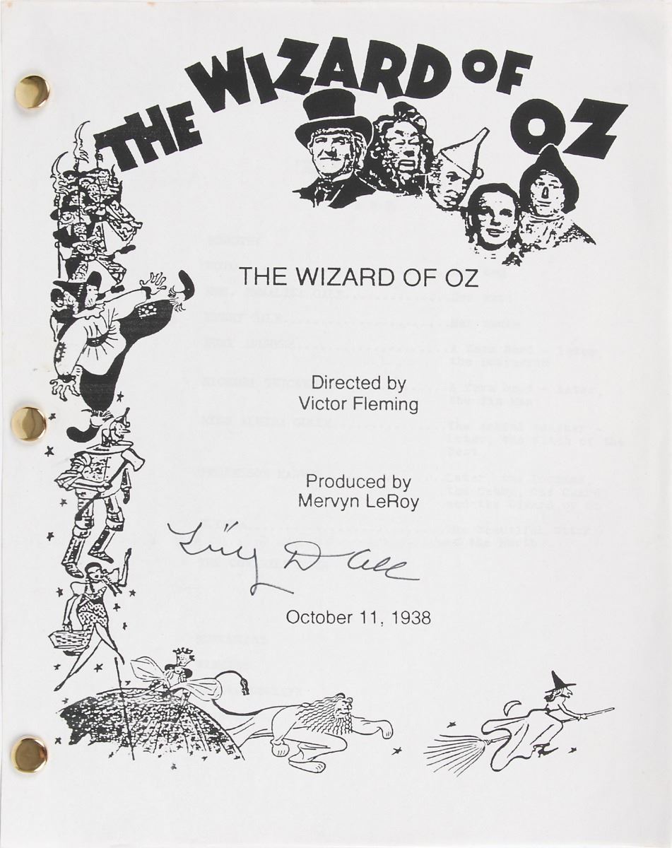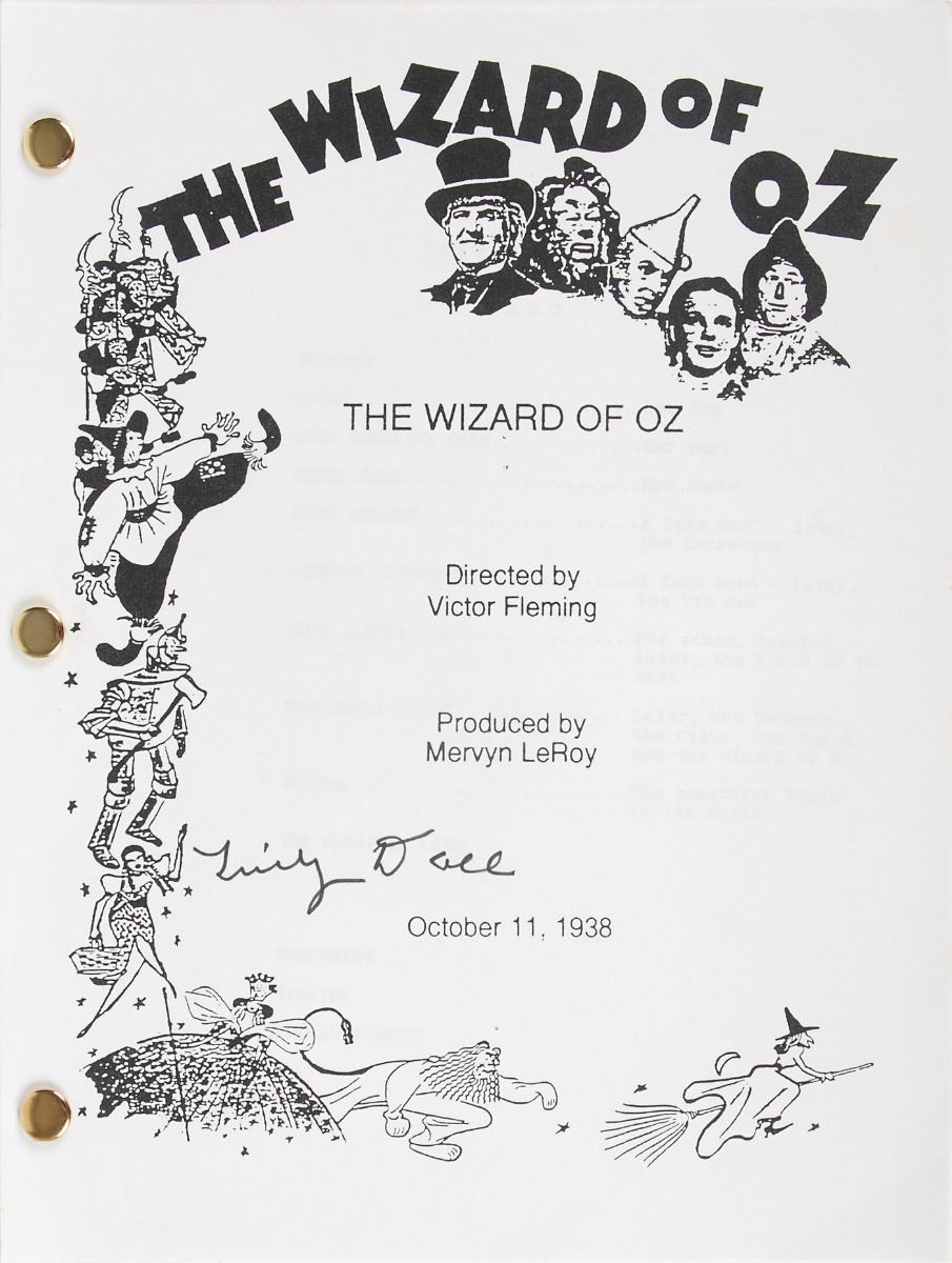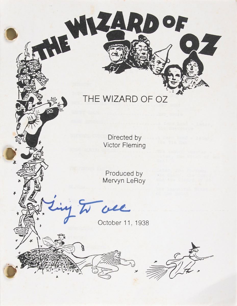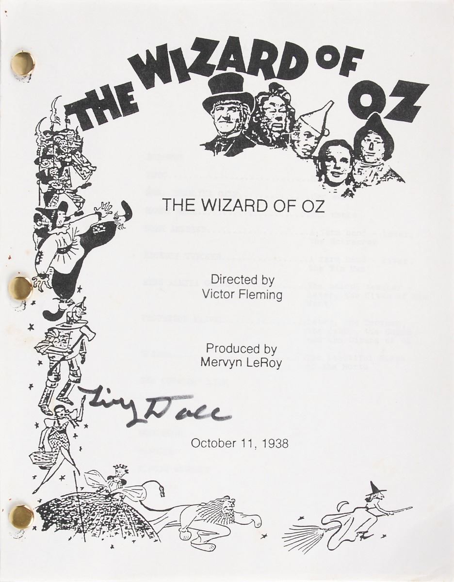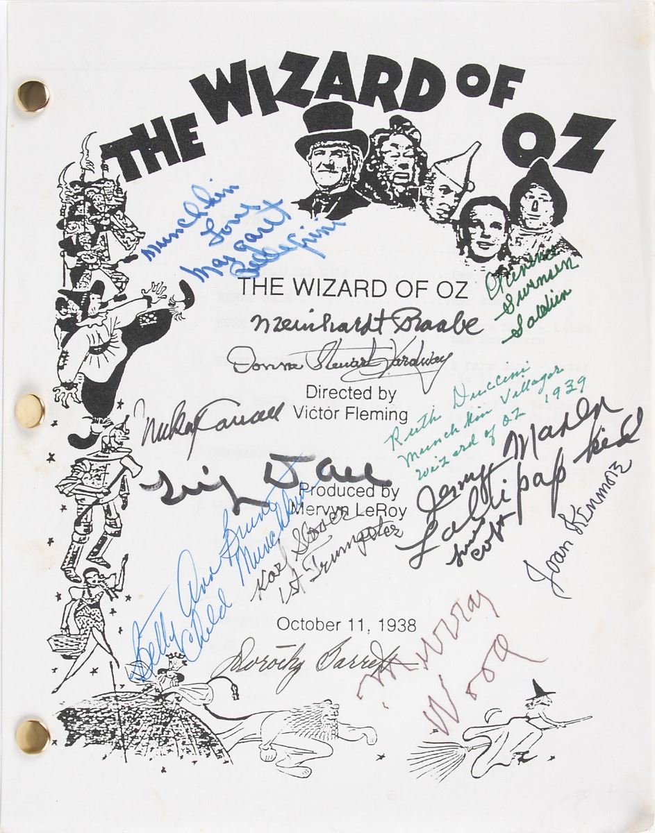 Set of five brad-bound souvenir typescripts for the classic 1939 film The Wizard of Oz, each 8.5 x 11, 112 pages, with four signed on the front cover in felt tip by Tony Doll, and the fifth signed on the front cover in various ink types by fourteen munchkins from the film, including: Tiny Doll, Margaret Pellegrini, Clarence Swensen, Donna Stewart–Hardaway, Ruth Duccini, Mickey Carroll, Betty Ann Cain Bruno, Dorothy Barrett, Karl Slover, Meinhardt Raabe, Jerry Maren, Murray Wood, Joan Kenmore, and Lewis Croft. In overall fine condition.