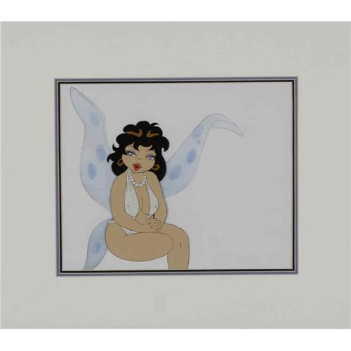 <B>Wizards Production Cel "Princess Elinore" (Bakshi Productions, 1977).</B></I> Along with her sheer, absurdly skimpy outfit, non-functional fairy wings, slightly Rubenesque figure, and sex-kitten personality, Princess Elinore was a full-powered fairy princess, too! This is an original hand-painted animation cel from Ralph Bakshi's 1977 feature film, "Wizards," featuring Princess Elinore, the sexiest pixie ever. This cel sits against her wings, which is a photocopy of the original production art. The art has an image area of 11.5" x 9" and is in Excellent condition.