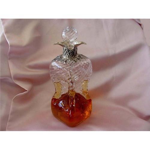 Great looking pinched decanter with swirled crystal body and a repousse sterling overlay neck made by the renowned silversmith Wm. Comyns. This wonderful decanter has it's original hollow stopper which also has the swirled design and fits perfectly. The sterling top has a four-way pouring spout and the glass base has a polished pontil. Decanter measures 10" tall and the base measures 3 1/2". Marks on silver are "WC", a lion, a leopard head, and a "g"--William Comyns, London, 1902. Excellent condition.
