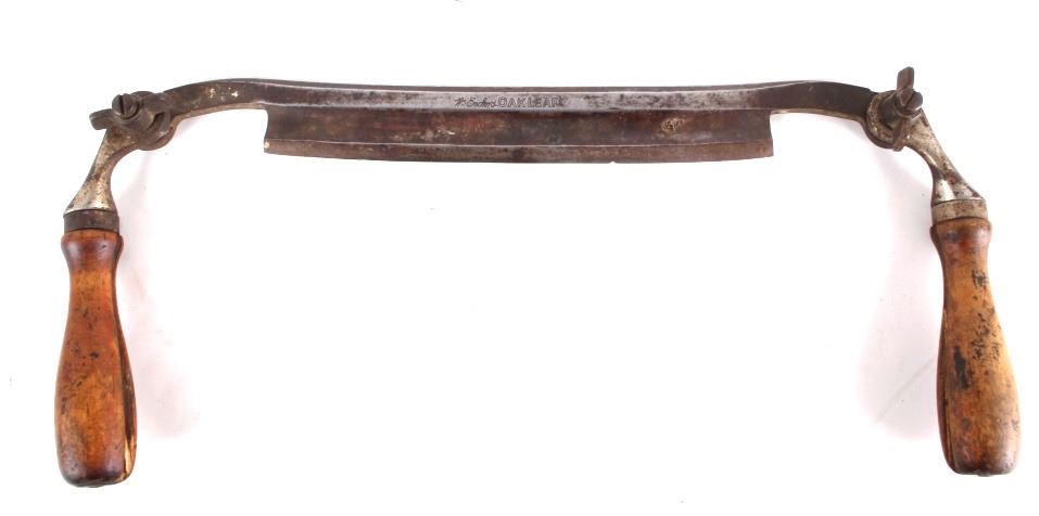 This lot features a Wm Enders Oak Leaf folding handle draw knife. Manufactured by the E.C. Simmons and Company in created 1871 and then incorporated as Simmons Hardware Company in 1874. One of there superior salesman from Texas named William Enders, he later became the companies vice president. During his years as salesmen a line of tools was named after him including the oak leaf cutter. The knife is in good condition for its age. Measures: 14" L x 2 1/4" H x 1 1/4" W