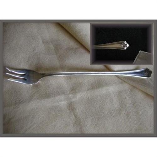 A Silverplate Cocktail fork by:International Silver/Wm Rogers. Hallmarked Pat'14, Eagle and Wm Rogers, Star. Fork is good-used condition,only slight imperfections consistant with age. Very elegant pattern "Ashland" dates back to 1914.