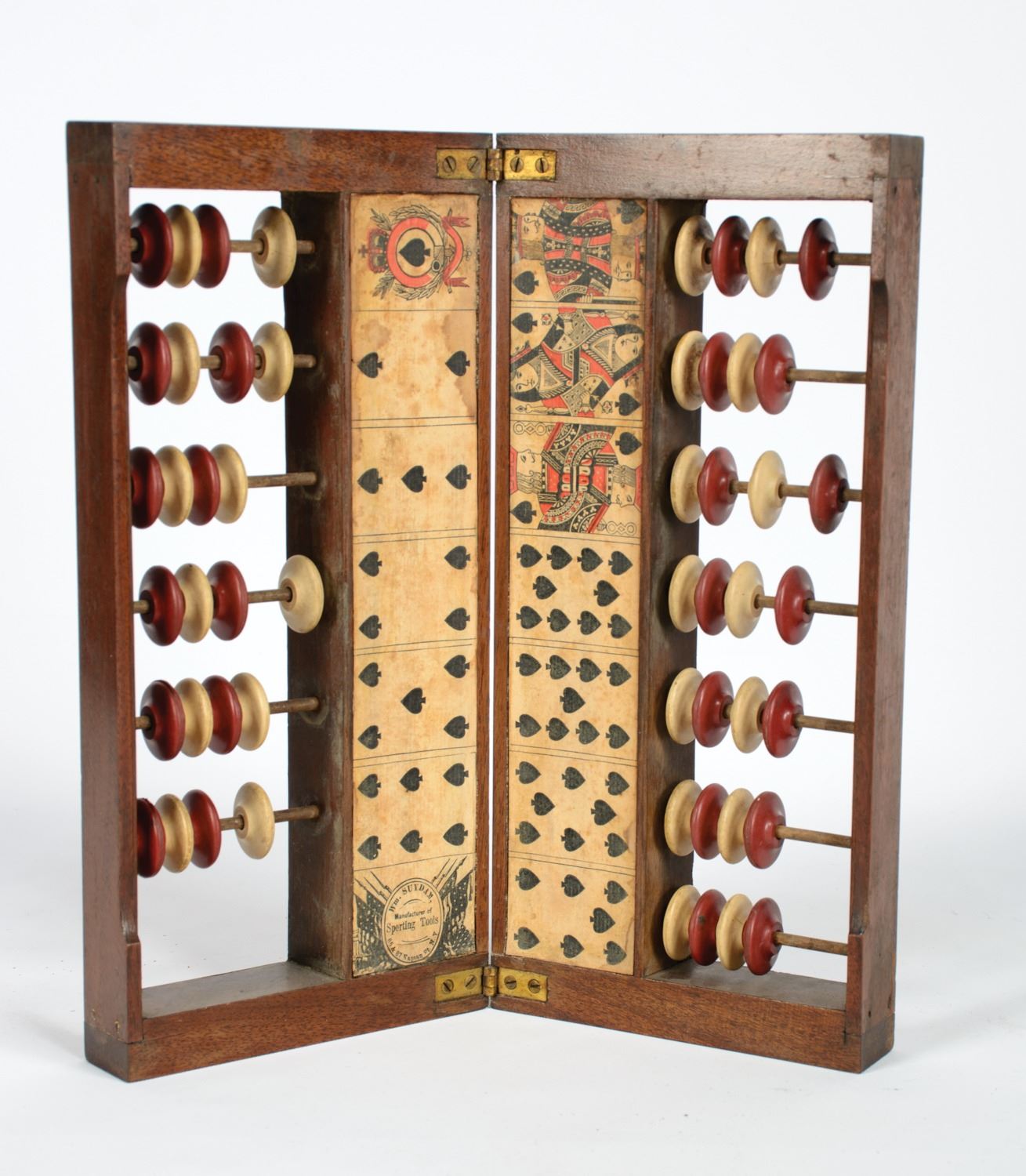 Skeleton style wood frame with red and white composition beads, set in paper court card strips. Marked on lower panel with Wm Suydam / Manufacturer of Sporting Tools / 65 & 67 Nassau St. N.Y., 11 3/4" x 10 1/2" (open), brass hinges. Paper is stained and browning.