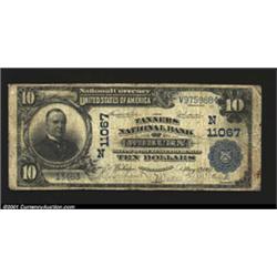 Woburn, MA - $10 1902 Plain Back Fr.<p>632 The Tanners NB Ch. # (N)11067 One of two very difficult Woburn banks to issue Large Sizes, the census here being a mere three notes. This example is a nicely centered Very Good-Fine with minor rust stains along the right border and corresponding area of the reverse. Important notice: We expect to be auctioning lots at the rate of 200-250 per hour. Sometimes eBay Premier live bid software cannot keep up with that pace, so we strongly recommend that you place a realistic proxy bid now as insurance to avoid disappointment. Also please note that all Heritage/CAA lots purchased through eBay Premier carry a 20% Buyer's Premium.