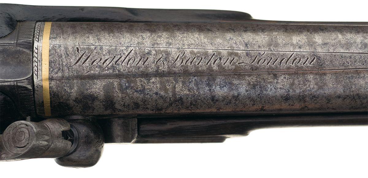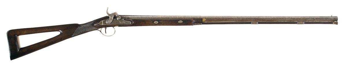 Made around the 18th or 19th Century. Nickel blade and groove sights, drum conversion, engraving, gold inlay and half length stock with an ebony ramrod, horn tip, checkered wrist, engraved shotgun buttplate and skeleton buttstock.