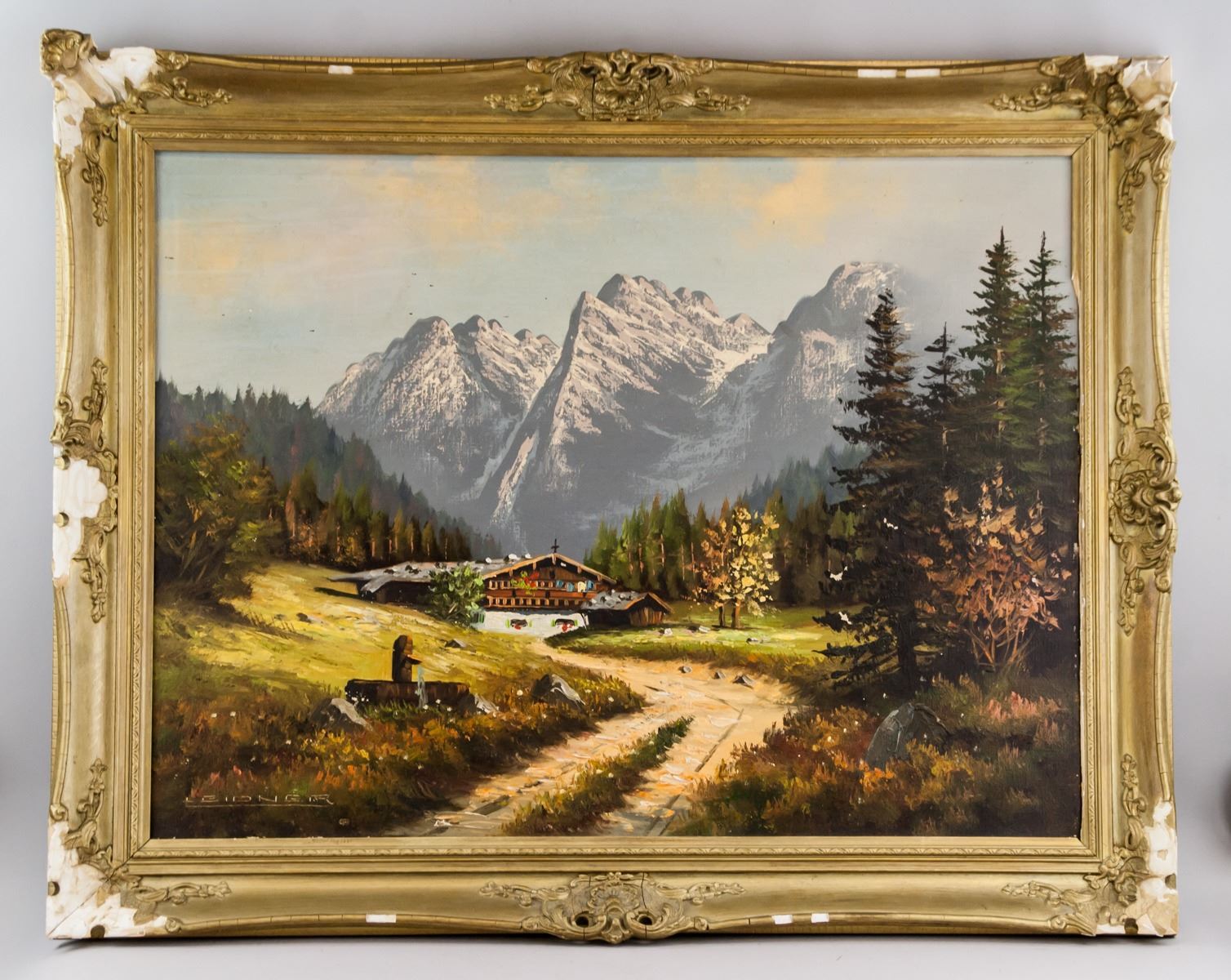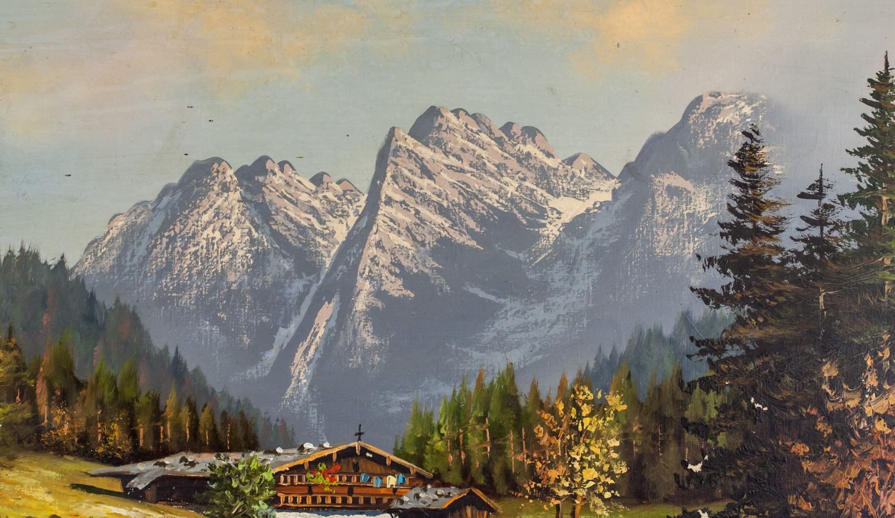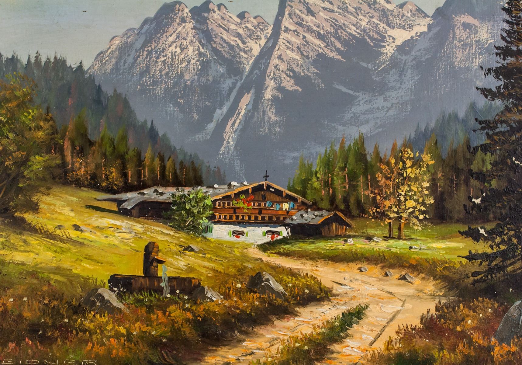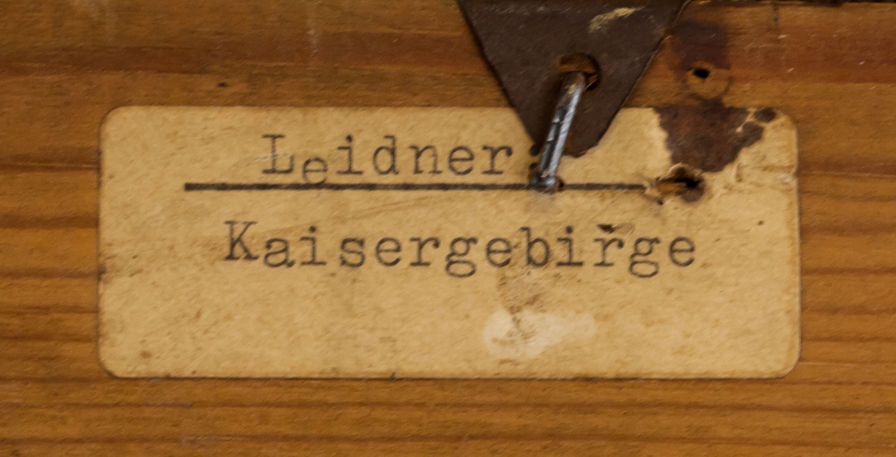 Oil on canvas, framed. Featuring a landscape scene with chalet or cabin underneath the Kaiser Mountains, Germany. Signed LEIDNER on the lower left corner. Label affixed to verso inscribed Leidner / Kaisergebirge. Attributed to Wohl Rene Leidner (20th century, German). 59 x 79 cm (23.2 x 31.1 inches). Framed size: 75 x 95 cm (29.5 x 37.4 inches). PROVENANCE: Private European collection (Bayern, Germany). Leidner was a German alpine painter in the middle of the 20th century.
