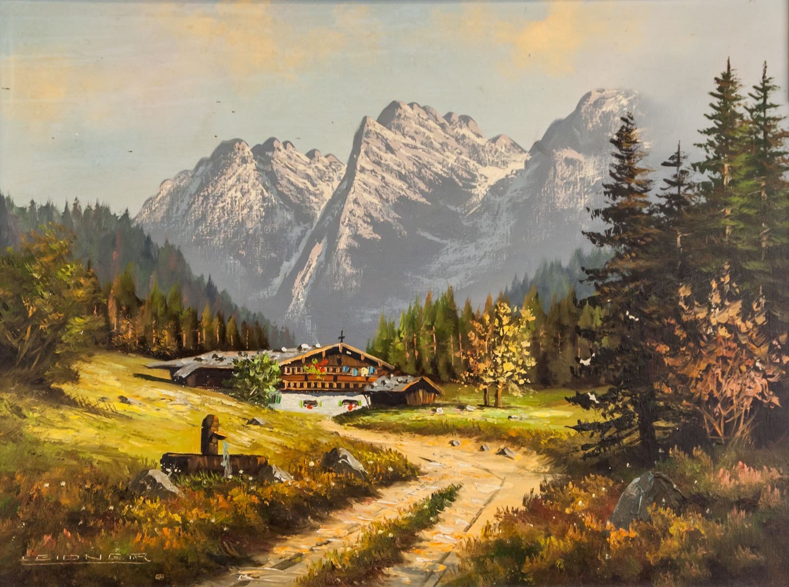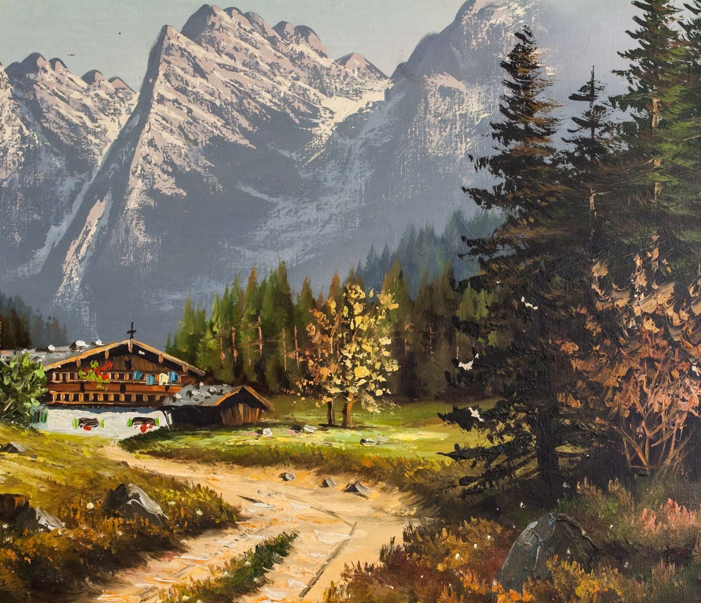 Oil on canvas, framed. Featuring a landscape scene with chalet or cabin underneath the Kaiser Mountains, Germany. Signed LEIDNER on the lower left corner. Label affixed to verso inscribed Leidner / Kaisergebirge. Attributed to Wohl Rene Leidner (20th century, German). 59 x 79 cm (23.2 x 31.1 inches). Framed size: 75 x 95 cm (29.5 x 37.4 inches). PROVENANCE: Private European collection (Bayern, Germany). Leidner was a German alpine painter in the middle of the 20th century.