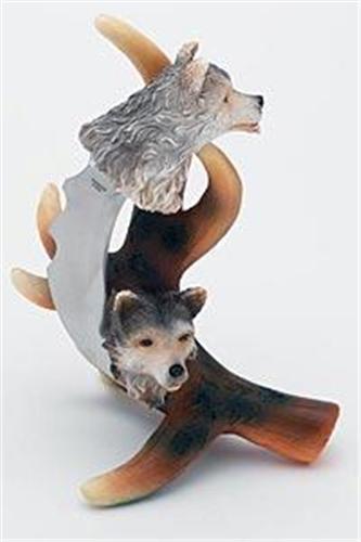 'Wolf ' 7-1/2 Display Knife displayed on a 9-1/8 tall faux elk horn stand. Lifetime warranty on the knife. Gift boxed
