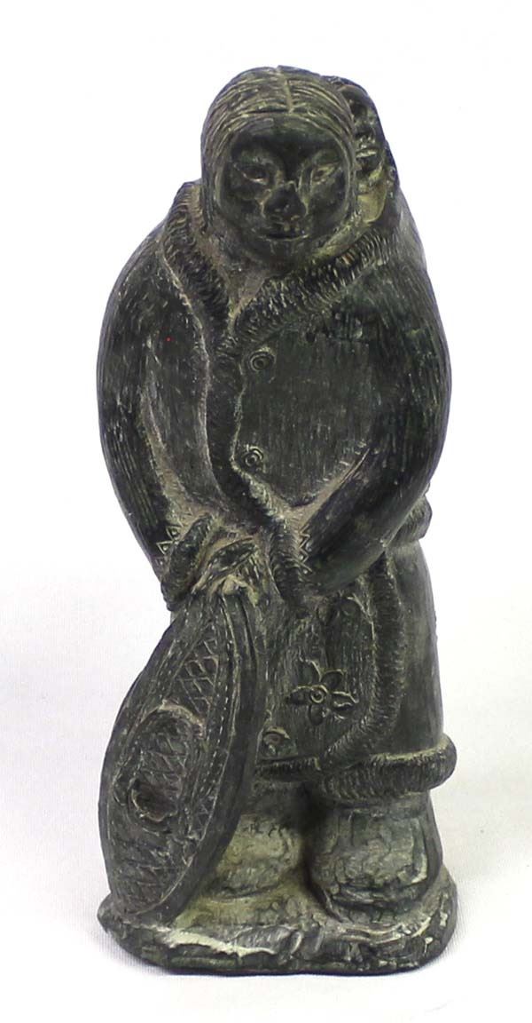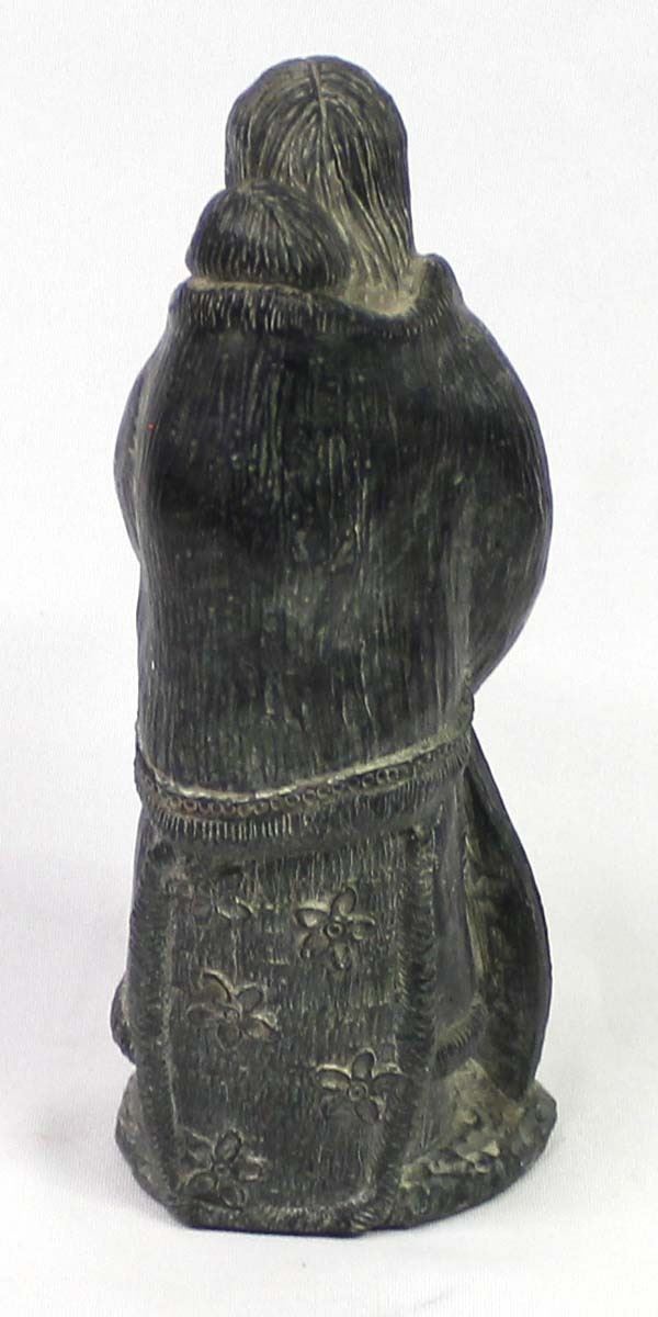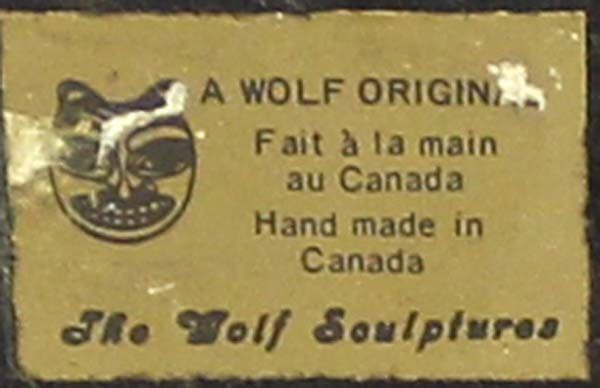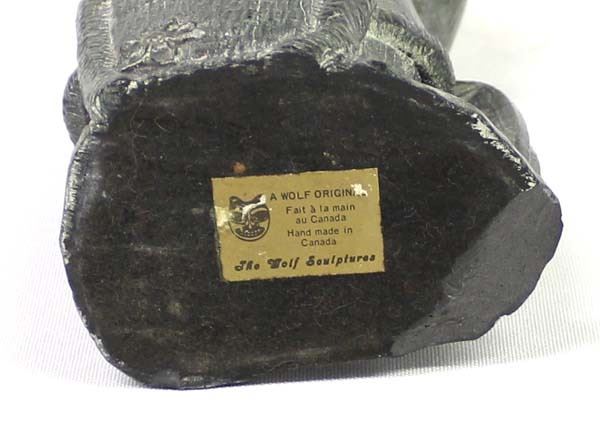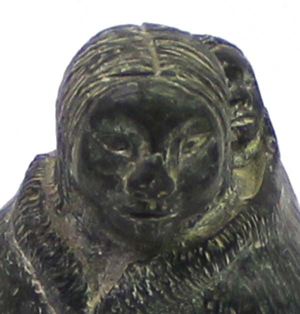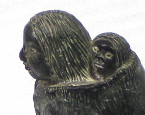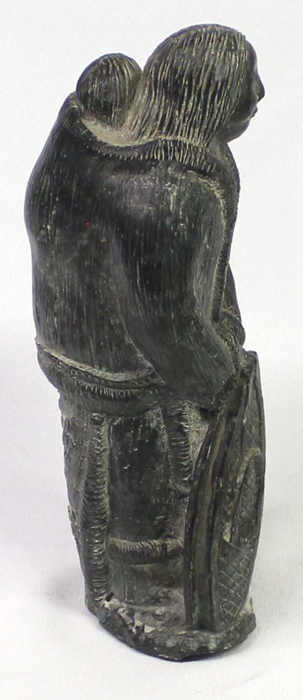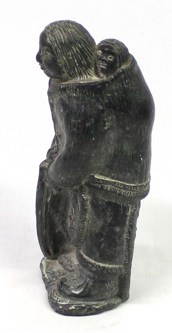 Wolf Original Canadian Soapstone Sculpture of Inuit Mother and Child, measures 7'' x 11'' x 2'', has original foil label on bottom, there is a chip on the bottom (base)