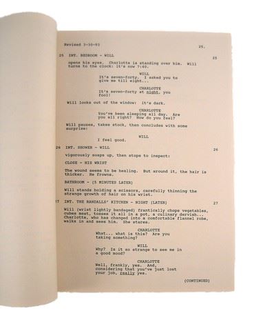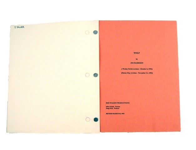 Wolf Screenplay Elaine May Version-"Wolf" (1994) is an extremely bizarre movie directed by Mike Nichols and starring Jack Nicholson (as well as his many time co-star Michelle Pfeiffer), as a publisher who becomes a werewolf! This is a rare script indeed, since it is the infamous Elaine May (Nichols long time collaborator and famous writer-director-actress in her own right) version which has never been seen before. May was famous for saving scripts in trouble (especially with "Tootsie"). "Wolf's" release was delayed for over eight months while the entire third act was reshot. Much of May's enormous contribution remains, though, as was the case of many of her ghost writing ventures, she did not receive credit on the film, which makes this version that much more fascinating and collectable.