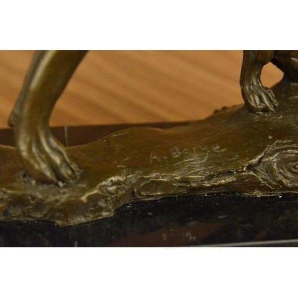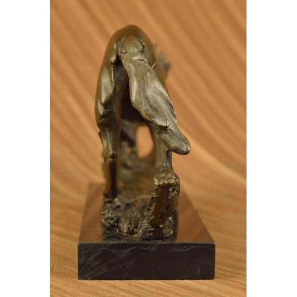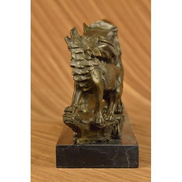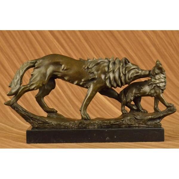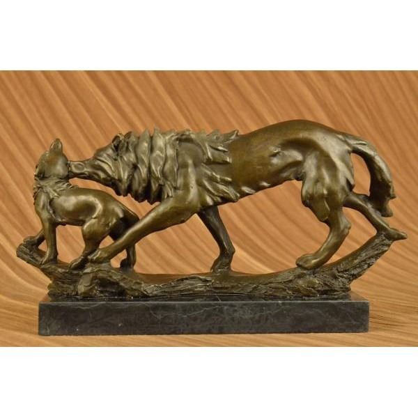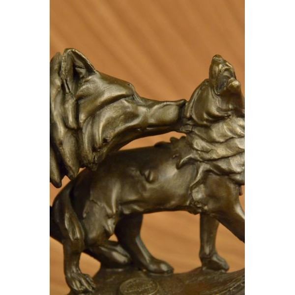 Wolves just the word sends chills into the heart of man either of deep hatred or great reverence. Whether loved or hated, there is no denying this creature is a highly social animal, totally committed to and concerned for the welfare of their family. The wolf has been all but crowded out of the US. His world has become a considerably smaller place to raise a family. So it is with man, our world is rapidly shrinking as well, despite the fact there are many wideopen spaces not yet used or developed. Seems we all want the same places, the same privileges, the same opportunities. What man has done to the wolf, he does to his own. I have not heard where a wolf family has killed one of their own. It is made of Bronze and cast through the Lost Wax Method. Bronze Dimensions with Marble Base: Height 9 X Width 15 inches. Weight: 14 LBS.