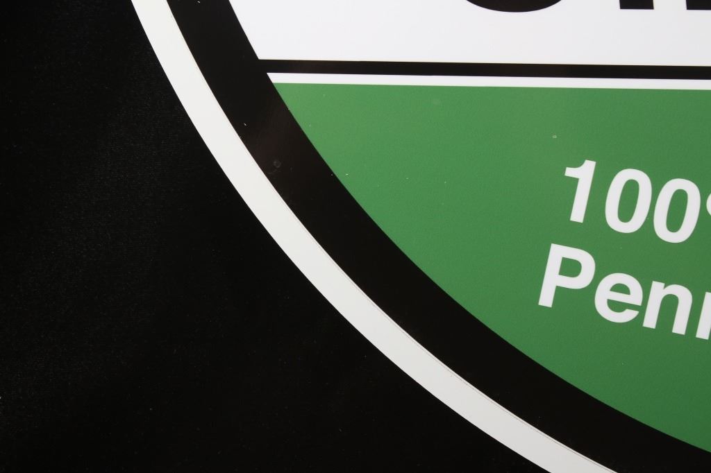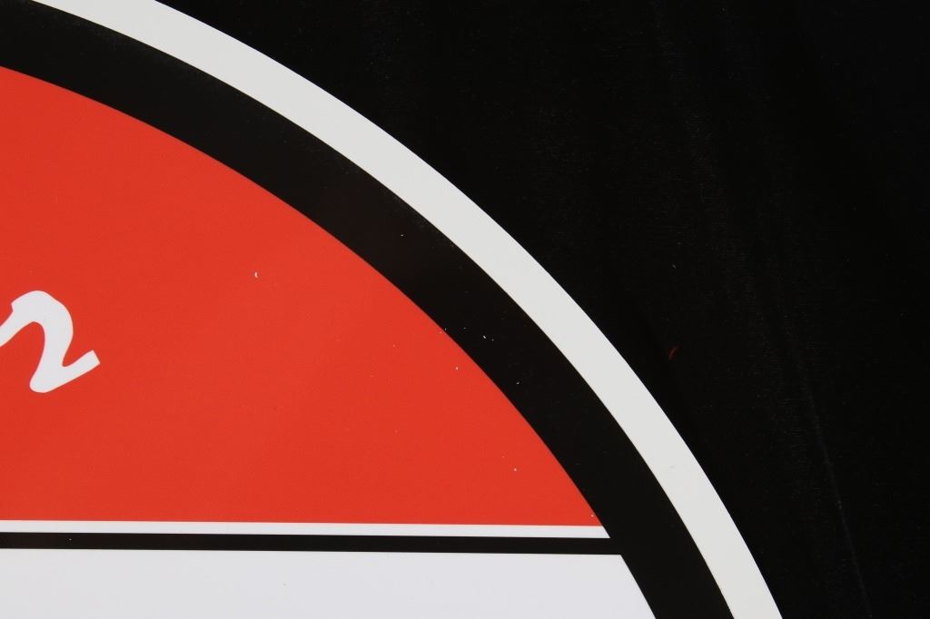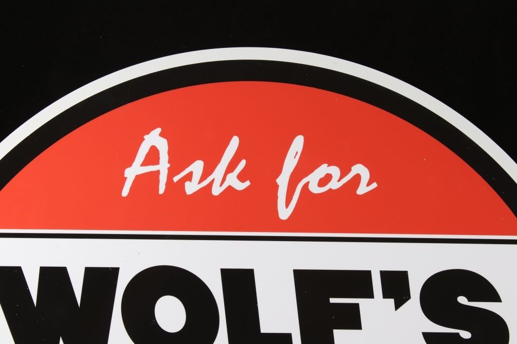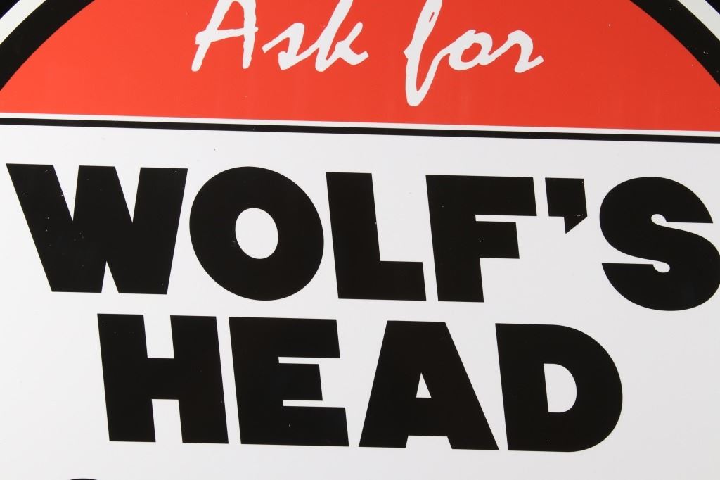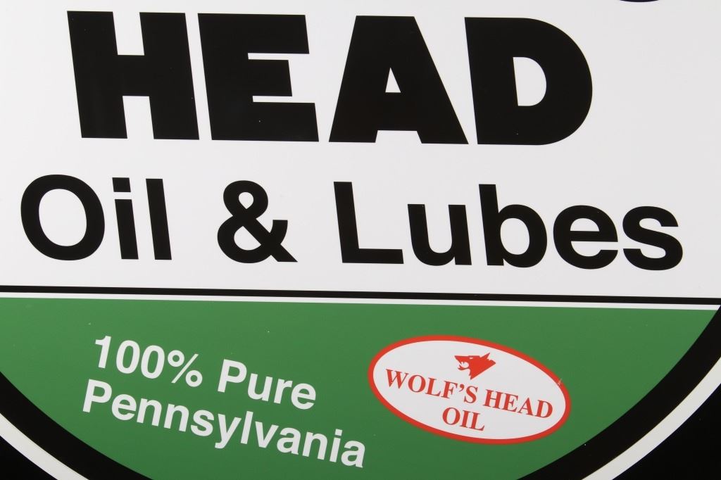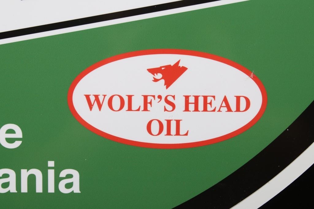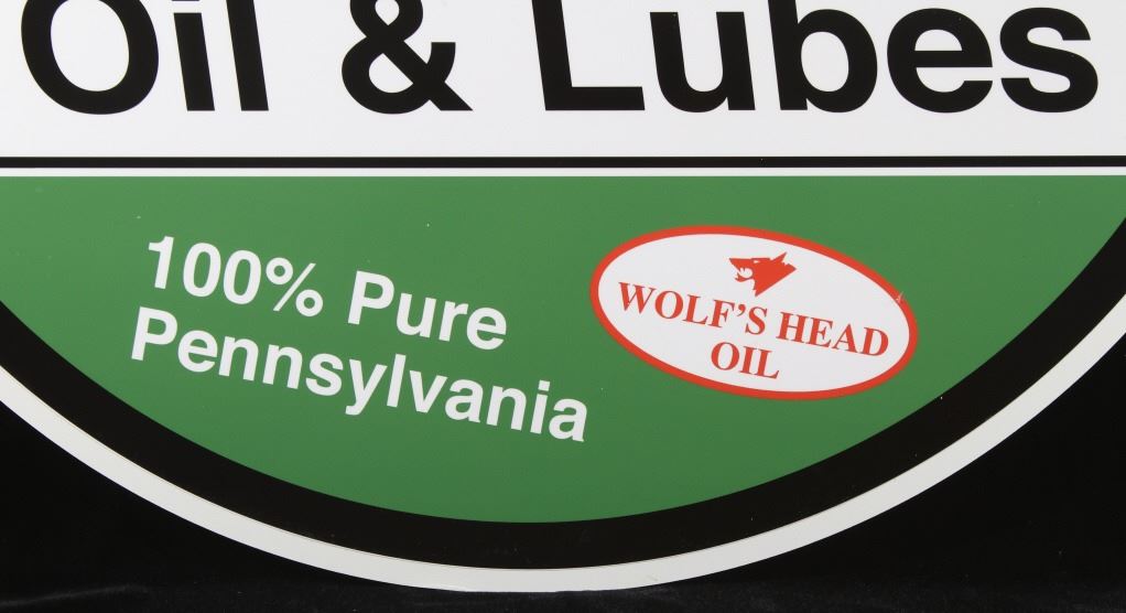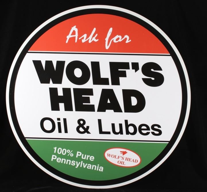 Offered in this lot we have a Wolf's Head oil and lube reproduction advertising sign. The sign features a red top, a white center, with green across the bottom. The piece is marked "Ask For Wolf's Head Oil & Lubes 100% Pure Pennsylvania" in white and black lettering. The bottom shows a red and white logo reading "Wolf's Head Oil" with the image of a wolfs head above the letters. The sign shows good condition overall and shows a diameter of 30".
