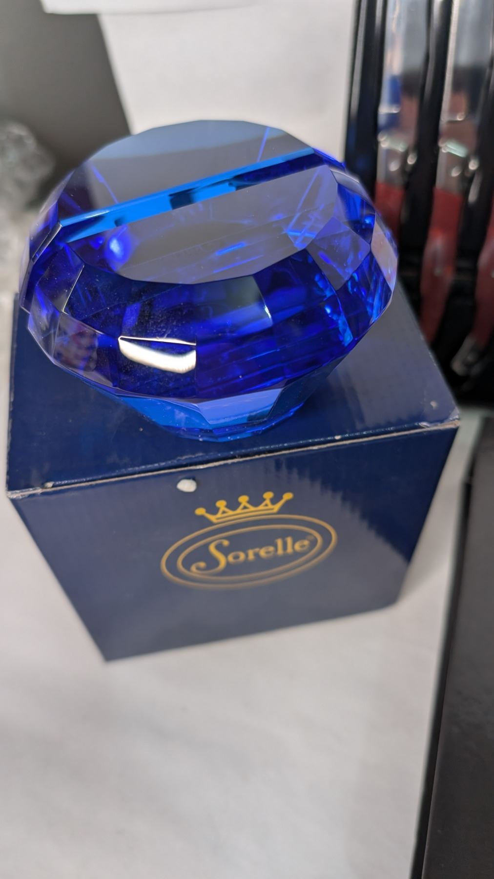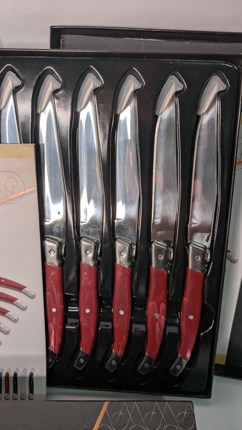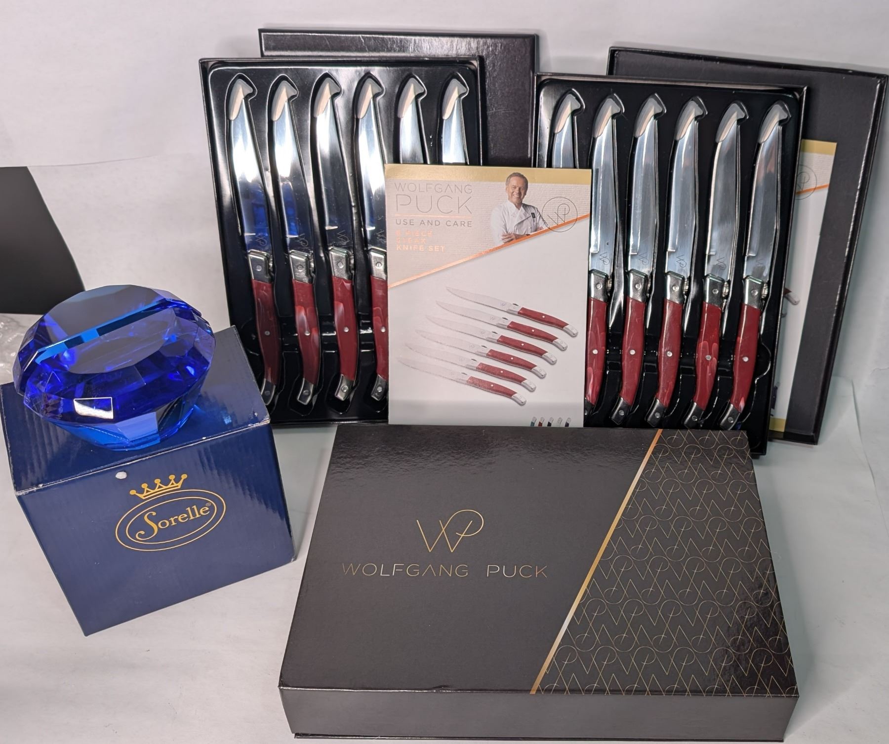 Wolfgang Puck Set of 12 Steak Knives Red & Sorelle Chrystal Card Holder NEW