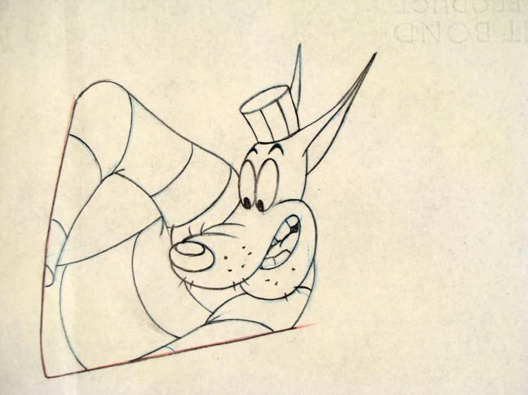 Offered here is an original production drawing of Wolfie from the "Northwest Hounded Police cartoon (1946). The wolf has escaped from "Alka-Fizz Prison" (a pun on Alcatraz Prison). When he escapes to Canada, the mounted police chief advises the mounties to capture him. When he asks any volunteers to come up, all of them stand back, except for Sgt. McPoodle (Droopy). The wolf is making his best attempts to escape. Much to his shock, McPoodle appears wherever he tries to hide. Eventually, the wolf is chased back into his own jail cell. After being re-captured, he ask himself (thus breaking the fourth wall) if there could have been more than one of the dogs chasing him. Outside his cell, hundreds of Droopy look-alike dogs ask him, "What do you think, brother?" * * It appears that Wolfie is trying to break out of jail again... * Original "rough" animation drawing, in non-photo blue, black, and red with the notations in black. * Overall size is a 12-field drawing that is 10 1/2" × 12 1/2" Very Good condition Traditional animation is a multi-step process which includes various types of art techniques. Drawings are a key part of the process, in which the animator creates the design and movement of the characters. Drawings are then transferred onto acetate cels (by hand-inking and/or photo copying) to create a production cel, which is then hand painted on the back side, using paint colors chosen and approved by the creator of the series. * * The drawing is ready to be matted and framed. The animators notations are located at the top and bottom of the drawing. There is some slight tears located at the bottom of the drawing. *