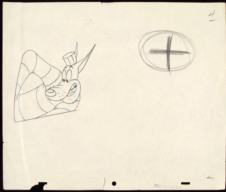Offered here is an original production drawing of Wolfie from the "Northwest Hounded Police cartoon (1946). The wolf has escaped from "Alka-Fizz Prison" (a pun on Alcatraz Prison). When he escapes to Canada, the mounted police chief advises the mounties to capture him. When he asks any volunteers to come up, all of them stand back, except for Sgt. McPoodle (Droopy). The wolf is making his best attempts to escape. Much to his shock, McPoodle appears wherever he tries to hide. Eventually, the wolf is chased back into his own jail cell. After being re-captured, he ask himself (thus breaking the fourth wall) if there could have been more than one of the dogs chasing him. Outside his cell, hundreds of Droopy look-alike dogs ask him, "What do you think, brother?" * * It appears that Wolfie is trying to break out of jail again... * Original "rough" animation drawing, in non-photo blue, black, and red with the notations in black. * Overall size is a 12-field drawing that is 10 1/2" × 12 1/2" Very Good condition Traditional animation is a multi-step process which includes various types of art techniques. Drawings are a key part of the process, in which the animator creates the design and movement of the characters. Drawings are then transferred onto acetate cels (by hand-inking and/or photo copying) to create a production cel, which is then hand painted on the back side, using paint colors chosen and approved by the creator of the series. * * The drawing is ready to be matted and framed. The animators notations are located at the top and bottom of the drawing. There is some slight tears located at the bottom of the drawing. *