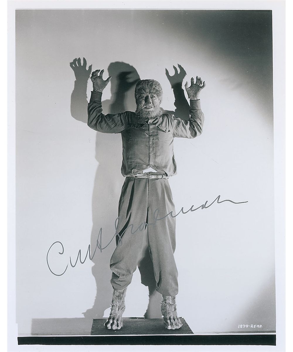 Novelist and screenwriter (1902–2000) known for writing horror and sci-fi films, most notably The Wolf Man and Donovan’s Brain. Glossy 8 x 10 full-length photo of Lon Chaney, Jr., as the Wolfman, signed in silver ink by Siodmak. In very fine condition.