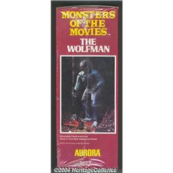 <B>Wolfman Model Kit (Aurora, 1975).</B></I> Introducing one of the more sought-after entries from Aurora's "Monsters of the Movies"... put your hands together for the Wolfman! Better yet, snap <I>him</B></I> together. The lycanthropic lummox has a glow-in-the-dark head, and both his head and his arms are movable, the better to maul you with. The figure comes with a base that includes a gnarled tree for that monster-movie feel. You'll howl when you see this specimen, which is Mint in its original box and still shrink-wrapped. <BR><BR><B>Important notice:</B> Heritage usually auctions material at the rate of 200-250 lots per hour. On some occasions eBay Live bid software or the Internet may not be able to keep up with the pace of the auction. We recommend placing a realistic absentee bid now as insurance to avoid disappointment. Occasionally the auctioneer may eliminate or reject an eBay Live bid, and the auctioneer may also reopen a lot after the close of the eBay live bidding (usually because we missed an audience bid), and may reject your bid even if it shows you as the winning bidder. By bidding via eBay Live, you agree that Heritage may award the lot to another bidder at its sole discretion under the circumstances described above or any other reasonable circumstances. Since eBay bids are not shown to us until we open the lot on the floor, we treat those bids just like floor bids. In most cases the floor responds before the eBay bid is presented to us, due to Internet lag time, so for consistency we have made it a policy that floor bids are always considered first over tie eBay live bids. Also please note that all Heritage lots purchased through eBay Live carry a 20% Buyer's Premium. Please make sure you read the Terms and Conditions before you bid.
