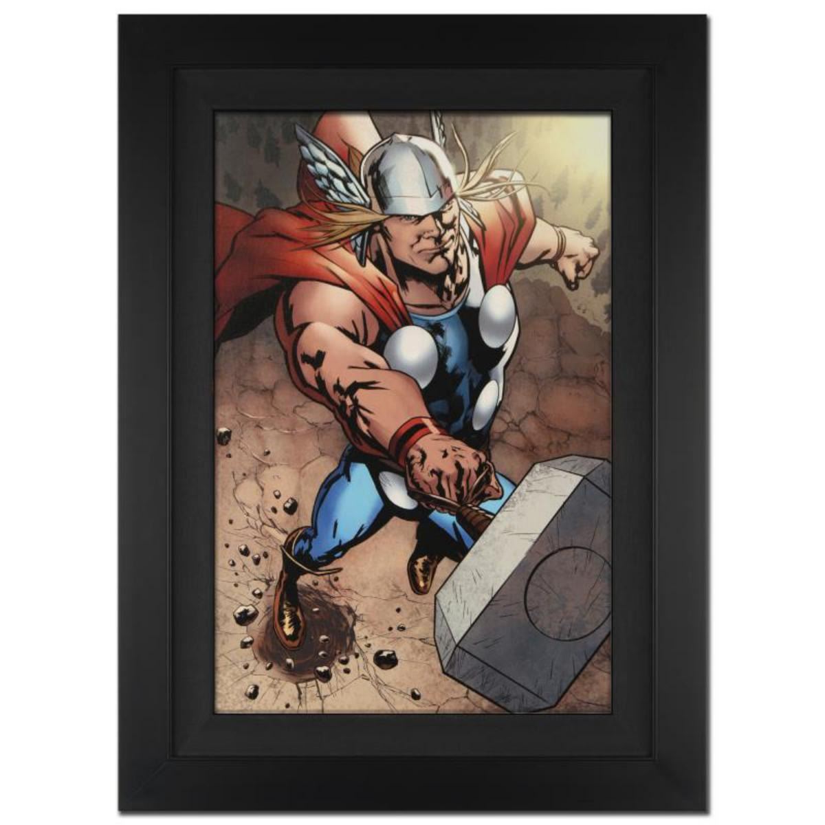 A piece of comic book history, this limited edition, from original art by Kaare Andrews, depicts the heroic Thor. Kaare Andrews is a Canadian comic book writer and artist and filmmaker known for his cover work on Incredible Hulk and many other comic books published by Marvel Comics. He was the first recipient of The Shuster Award for Outstanding Artist in 2005 for his work on Spider-Man: Doctor Octopus. He has also worked on Ultimate X-Men, Gen, The Amazing Spider-Man and The Matrix Comics. "Wolverine Avengers Origins: Thor #1 & The X-Men #2 " is an extremely limited edition giclee on canvas by Kaare Andrews presented by Marvel Comics, hand signed by the Great Stan Lee (1922-2018) and numbered out of only 4! This piece has been custom framed and ready to hang. Includes Certificate of Authenticity! Measures approx. 29" x 40" (with frame); 22" x 33" (image). Reference #: 203803.