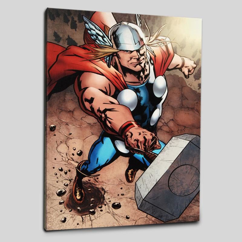 A piece of comic book history, this limited edition, from original art by Kaare Andrews, depicts the heroic Thor. Kaare Andrews is a Canadian comic book writer and artist and filmmaker known for his cover work on Incredible Hulk and many other comic books published by Marvel Comics. He was the first recipient of The Shuster Award for Outstanding Artist in 2005 for his work on Spider-Man: Doctor Octopus. He has also worked on Ultimate X-Men, Gen, The Amazing Spider-Man and The Matrix Comics. "Wolverine Avengers Origins: Thor #1 & The X-Men #2 " is a limited edition numbered giclee on stretched canvas by Kaare Andrews presented by Marvel Comics. This piece comes gallery wrapped. Includes Certificate of Authenticity! Measures approx. 18" x 27" (image); 1.5" (depth).