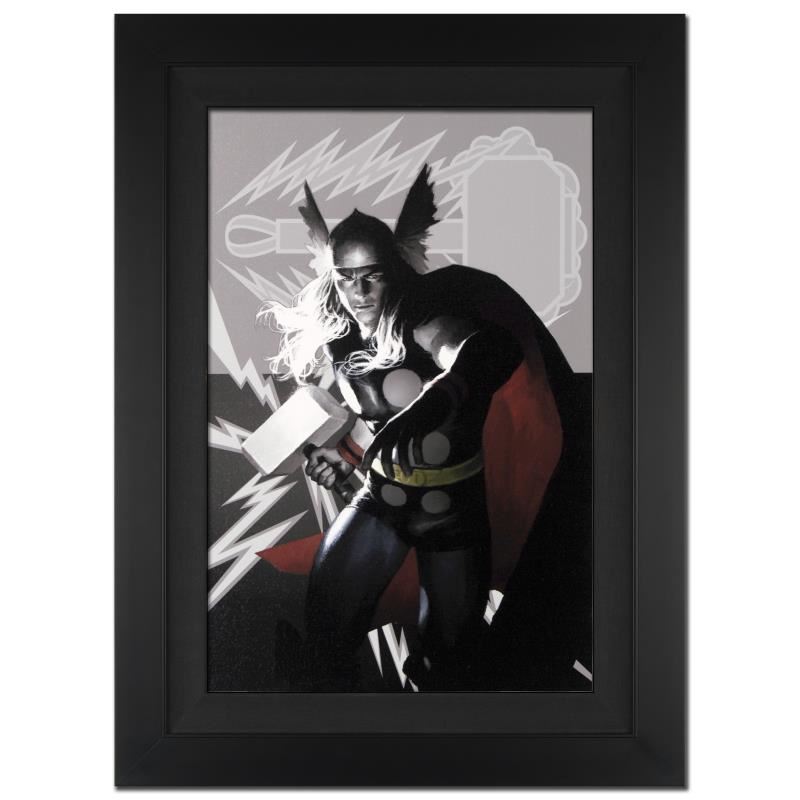 A piece of comic book history, this limited edition, from original art by Al Barrionuevo, depicts the heroic Thor. Al Barrionuevo has worked on many DC titles as well as Marvel comics such as X-Men, Avengers: Solo, Marvel Zombies Destroy!, and Storm Watch. "Wolverine Avengers Origins: Thor #1 & The X-Men #2 " is an extremely limited edition giclee on canvas by Al Barrionuevo presented by Marvel Comics, hand signed by the great Stan Lee and numbered out of only 10! This piece comes custom framed and ready to hang. Includes Certificate of Authenticity! Measures approx. 25" x 34" (with frame); 18" x 27" (image).