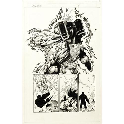 With the help of the white-haired cyborg known as Cable, Wolverine decapitates a futuristic rogue warrior, in this page from "Guts 'n' Glory," written by Joe Casey. The image area measures 10" x 15", and the condition is Excellent.<BR><BR><b>Shipping:</b> Small Flat (<a target="_blank" href="http://www.heritageauctions.com/common/shipping.php">view shipping information</a>)