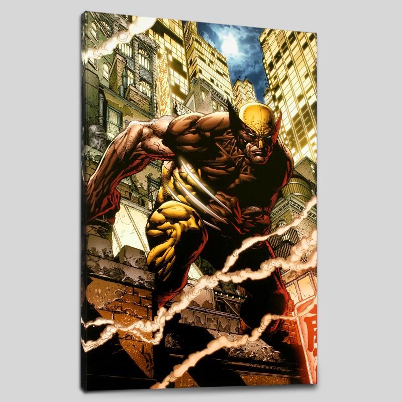 A piece of comic book history, this limited edition, from original art by John Romita Jr., depicts the heroic Wolverine. John Romita Jr. began his career at Marvel UK, doing sketches for covers of reprints. His American debut was with a six-page story entitled "Chaos at the Coffee Bean!" in The Amazing Spider-Man Annual #11 in 1977. His early popularity began with his run on Iron Man in 1978. Since then he has worked on many other comic book series including Thor, Fantastic Four, Daredevil and X-Men. "Wolverine Enemy of the State MGC #20" is a limited edition giclee on canvas by John Romita Jr., presented by Marvel Comics. This piece comes gallery wrapped. Includes Certificate of Authenticity! Measures approx. 18" x 27" (image); 1.5" (depth).