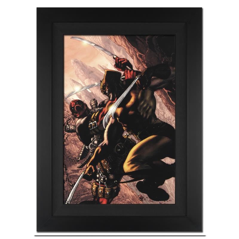 A piece of comic book history, this limited edition, from original art by Simone Bianchi, depicts the classic characters Wolverine and Deadpool. Known for his use of ink wash in his work, Simone Bianchi is an Italian comic book artist famous for his X-Men Unlimited artwork. "Wolverine: Origins #21" is a limited edition giclee on canvas by Simone Bianchi presented by Marvel Comics, hand signed by the great Stan Lee and numbered out of only 10! This piece has been custom framed and ready to hang. Includes Certificate of Authenticity! Measures approx. 25" x 34" (with frame); 18" x 27" (image).