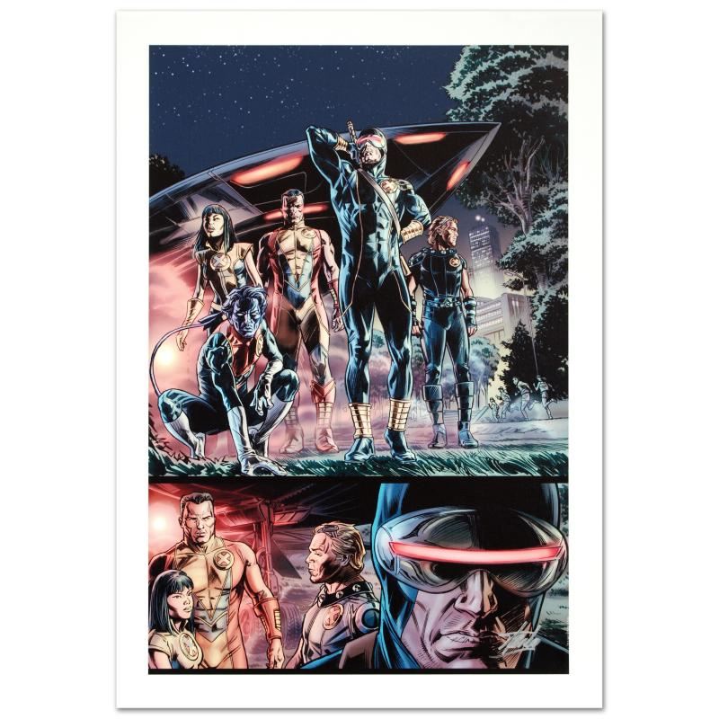A piece of comic book history, this limited edition, from original art by Doug Braithwaite, depicts Cyclops, Nightcrawler, Colossus, Cannonball and Armor. Doug Braithwaite started out working on British comics, like 2000 AD and A1, but is best known for his Marvel Comics work on the Earth X sequels, Universe X and Paradise X, as well as The Punisher Kills, the Marvel Universe, and Punisher: MAX. "Wolverine: Origins #34" is a limited edition giclee on canvas by Doug Braithwaite presented by Marvel Comics, numbered and hand signed by the Great Stan Lee (1922-2018)! Includes Certificate of Authenticity! Measures approx. 18" x 27" (image).