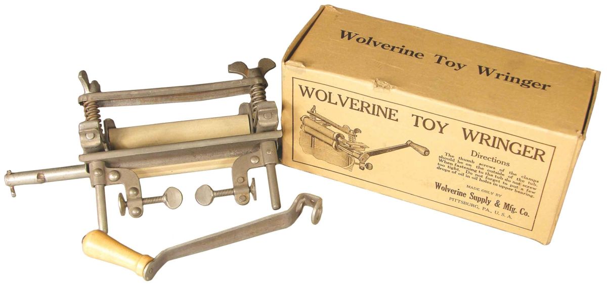 Wolverine Toy Clothes Wringer. Unused in original box. Wolverine Supply and Mfg. Co. Pittsburg, PA. Wringer like new, box has tear in back side. 8 inches wide. Start Price $20