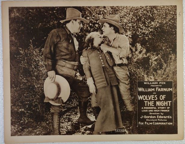 Wolves of the Night (Fox Film Corporation, 1919) lobby card. Drama. Starring William Farnum, Louise Lovely, Lamar Johnstone, Charles Clary, Al Fremont, G. Raymond Nye, Carrie Clark Ward, Irene Rich. Directed by J. Gordon Edwards. Light edge wear, light creases, tape. Excellent. (11"x14").