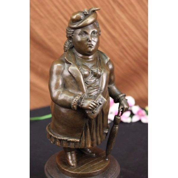This stoic abstract woman goes out one cloudy afternoon to run a few errands. She is dressed in a long sports jacket over a blouse and skirt. She wears a hat, which is tipped to the side. She clutches a purse in one hand and an umbrella in the other, prepared for the spring day showers ahead. This brown patina sculpture was cast using the lost wax method and mounted on a marble base. Bronze dimensions with marble base: Height 14 X Width 6 inches. Weight: 15 lbs.