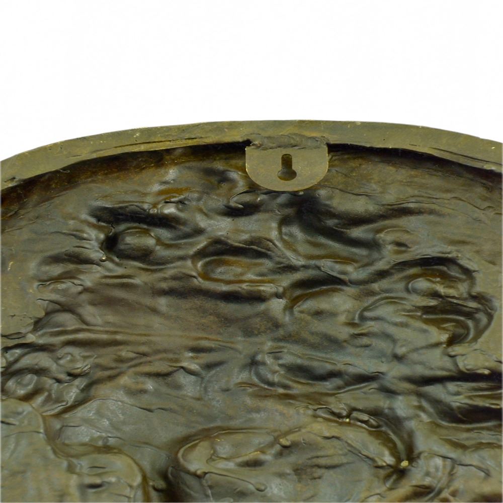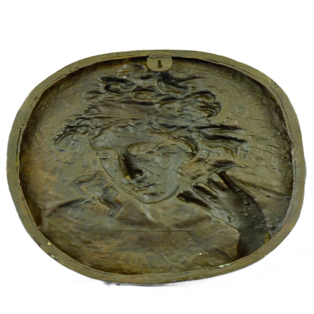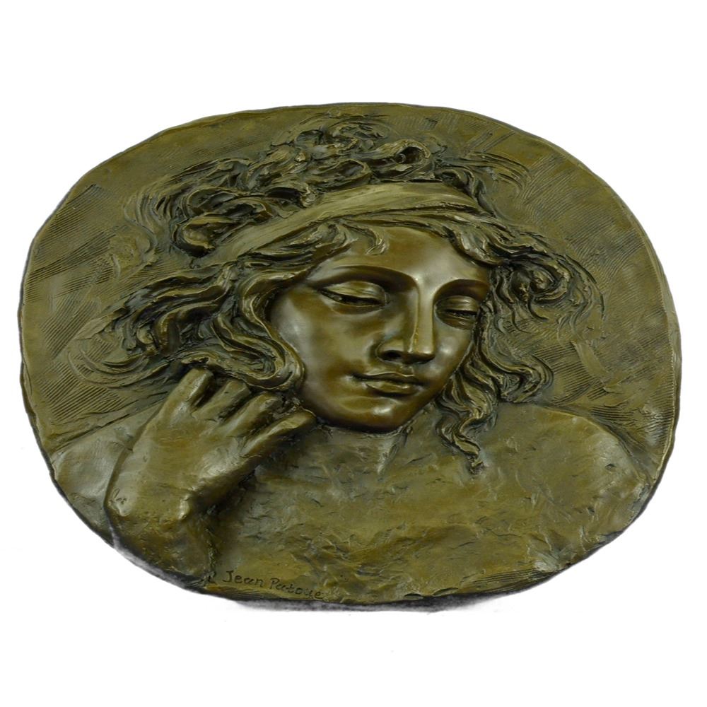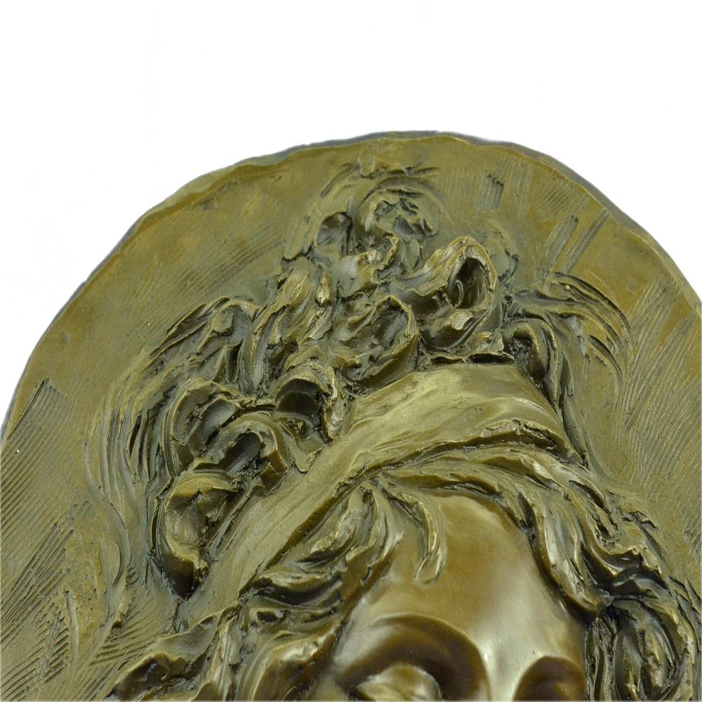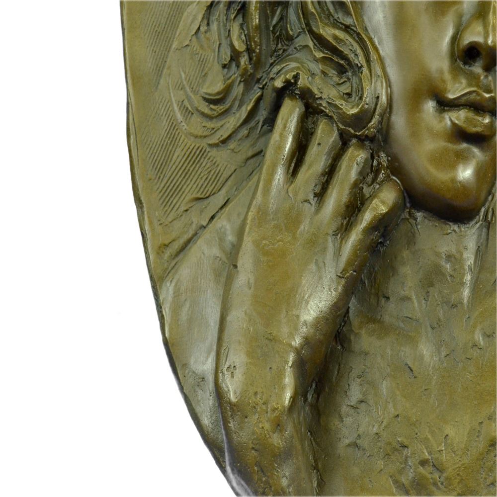 This beautiful wall piece depicts a the profile a young woman. Her expression is solemn. Her hair hare is styled in soft waves. This elegant piece will add class and style to any living room, dining room or parlor. The piece wax crafted using the lost wax method. Bronze Dimensions: Height 18 X Width 15 inches. Weight: 15 LBS.