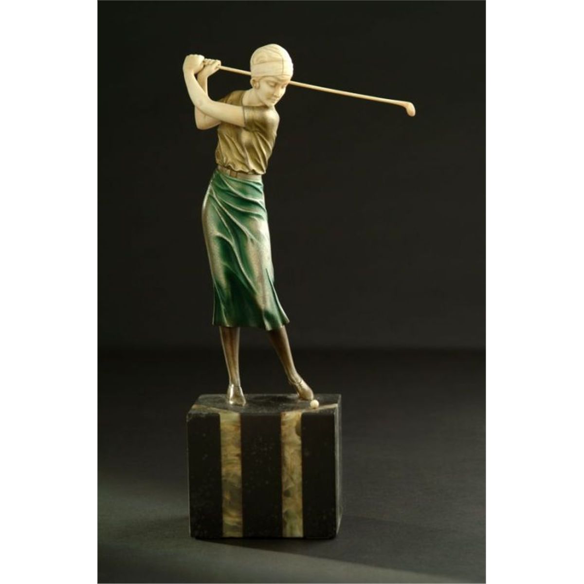 Bronze and ivory sculpture, Woman Golfer. Base signed, All ivory under lawful government permit, beautifully patina bronze, sits on a marble/onyx base. Some variations of marble and patina might occur.