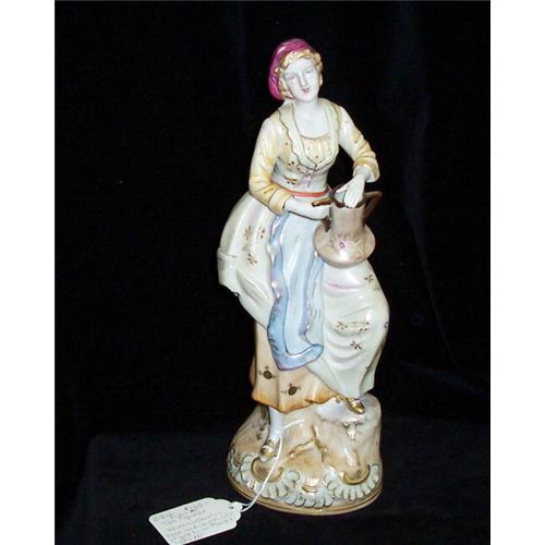 Large figurine of a woman holding an urn. Very pretty with lots of gold trim. Bottom is marked,