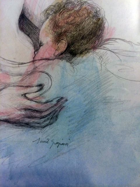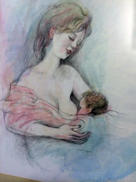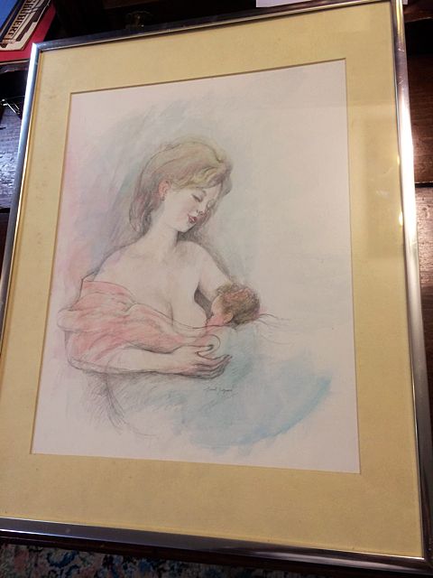 Woman and Nursing Child, signed by Sante Graziani. Framed and matted, measure 14 1/2" x 18 1/2". Sante Graziani was a personal friend of the owner, many of his original works are offered from the in this auction. Sante Graziani (1920–2005) was an American artist and art educator. He was known for his murals, which adorned many public buildings. Graziani was educated at the Cleveland Institute of Art and later at Yale University. He met with success early in his career, winning the Pulitzer Traveling Scholarship in Art at the age of 22. Soon after military service in World War II, he began a career as an art educator. He taught at Yale University School of Art from 1946 to 1951. Graziani initially gained recognition for his murals. Among his works were a mural at the Holyoke (Mass.) Public Library and one at the Museum of Fine Arts in Springfield, Massachusetts. In the years around the United States bicentennial celebration in 1976, he produced paintings that included references to well known images of George and Martha Washington. He was commissioned to paint a colorful and decorative mural featuring an image of George Washington on the side of a building in Worcester, Massachusetts, in that era.