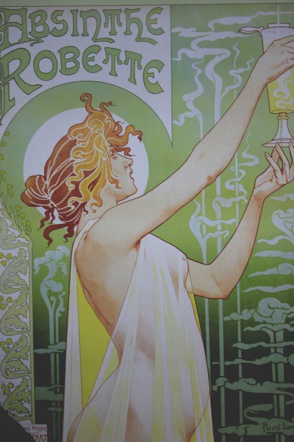 Woman holding up a glass of absinthe **|**|** 24X36IN; UNFRAMED; This poster is of a vintage ad for Absinthe Robette, by Livemont. It shows a woman holding up a glass of absinthe. At the top it says 'Absinthe Robette'. Absinthe is a distilled, highly alcoholic, anise-flavoured spirit derived from the medicinal plant, grand wormwood. It is known for its popularity in late 19th and early 20th century France, particularly among Parisian artists and writers whose romantic associations with the drink linger in popular culture. T. Privat-Livemont (1861 ; MSRP: $850