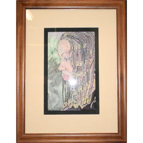 Rose Brown?s original India ink & colored pencil drawing entitled ?Woman in Beaded Braids? captures an African American woman?s side profile. Brown has rendered the woman to appear contemplative with beaded braids and a rich colorful background. The intense contrast of the black braids and highlighting compared with the colorful mix of vibrancy pushes the profiled woman to the foreground of the composition. The subtle contouring of the woman?s face and hair is rendered with delicate shifts of light and shadow, even incorporating soft grays and white to show the slight reflections of the color-muted background. This beautiful drawing is double matted in a fitting butter rum color top mat which compliments the soft hues within the composition and a black sponge bottom mat to accentuate the woman?s black braids. The piece is mounted in a medium oak wooden frame which echoes the soft highlights of the background and brings the overall measurements to 14? x 18.? The unique matting and framing presentation of this piece was individually selected and created by Le Chateau?s renowned master framer, Jeanette Shoenrock, and bears her signature on the back. This is truly a gorgeous, and affordable, original drawing that would be the perfect gift for anyone in your family.