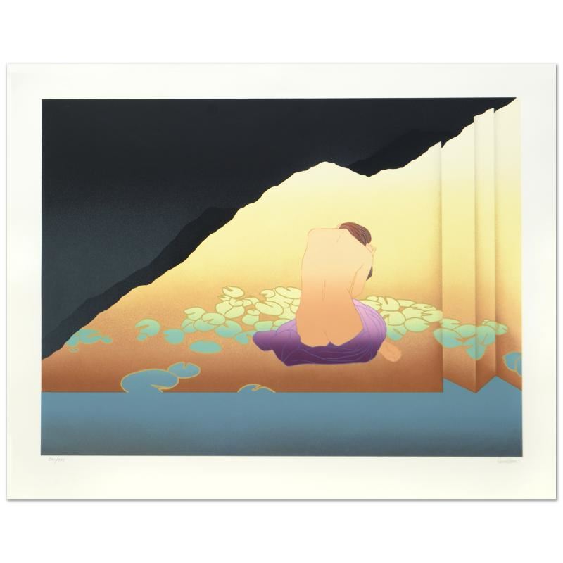 "Woman in Lillied Shoji" is a limited edition serigraph on paper by Derrick Brown, numbered and hand signed by the artist! Includes Certificate of Authenticity! Measures approx. 46" x 36.5" (with border), 40" x 30" (image).