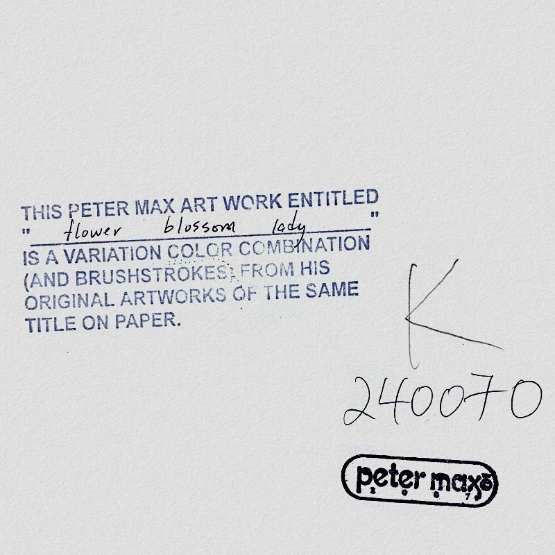 "Woman in Love" is a one-of-a-kind mixed media on paper, hand signed by Peter Max. The piece comes custom framed with a backside cutout to display Peter Max Studio registration number 240070 certifying authenticity. Measures approximately 30" x 42" (frame), 24" x 36" (image). This item requires special handling and may have a longer than usual turnaround.