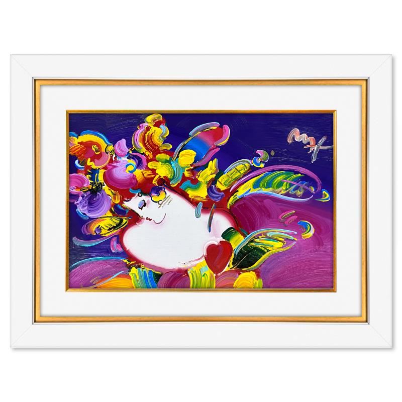 "Woman in Love" is a one-of-a-kind mixed media on paper, hand signed by Peter Max. The piece comes custom framed with a backside cutout to display Peter Max Studio registration number 240071 certifying authenticity. Measures approximately 36" x 48" (frame), 24" x 36" (image). This item requires special handling and may have a longer than usual turnaround.
