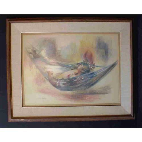 A large and striking very nice drawing on the style of Zuniga. Purchased in Mexico in the 70's. This is framed and matted Very soft colors yet vibrent in its own way. Very plesent to look at.
