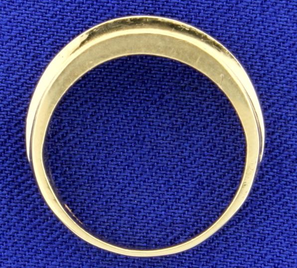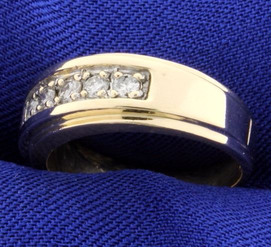In 14K yellow gold, it contains five round high quality diamonds ranging in size from .04 to .06 cts each with SI clarity and H color. Size 5 1/2        5.8g