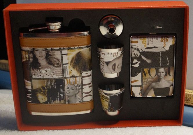 Contains Stainless Steel Flask, 2- Shot Glasses, And Cigarette Holder. New in Box.