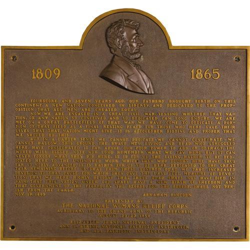 <B>National Woman's Relief Corps Lincoln Dedication Plaque.</B></I> Bronze, 25" x 23.5", no foundry marks, circa 1959. A beautifully executed heavy bronze plaque with relief portrait of Lincoln and the text of his "Gettysburg Address". The piece was commissioned by the National Woman's Relief Corps, Auxiliary to the Grand Army of the Republic and presented in August of 1959. The National Woman's Relief Corps is a patriotic organization formed to perpetuate the memory of the Grand Army of the Republic and all those who served the United States in any war. The condition is lovely and would make a fine addition to a Lincoln collection.<BR><BR><b>Shipping:</b> Miscellaneous Collectibles, Larg (<a target="_blank" href="http://www.heritageauctions.com/common/shipping.php">view shipping information</a>)